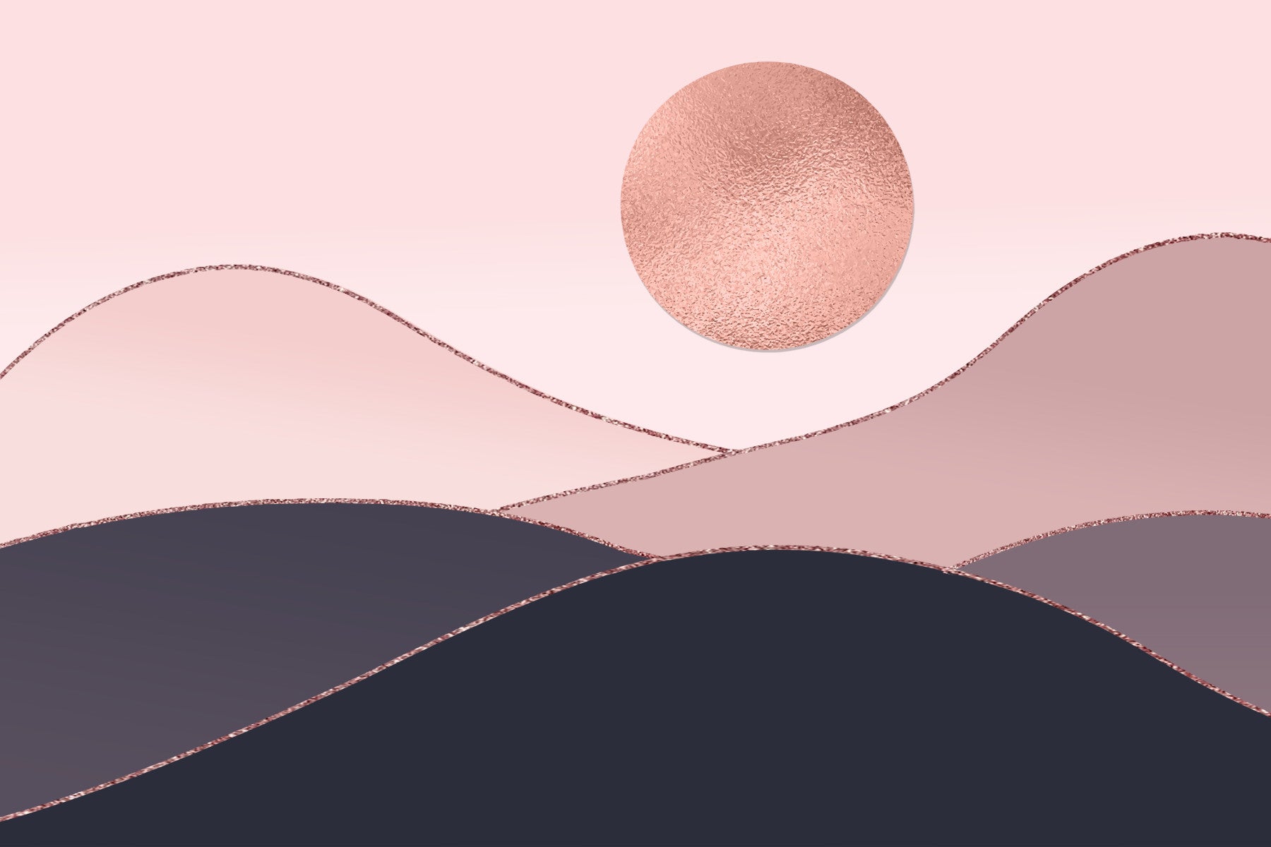 Discover a captivating design with layers of hills and a golden sun. This wallpaper for walls brings subtle beauty to your space. It features a palette of blush pink, mauve, and dark blue, all highlighted with a rose gold shimmer. The design creates a sense of depth and calm. Install this in bedrooms, living rooms, or offices for a chic and modern feel. Its smooth lines and elegant colors work perfectly with contemporary interiors.