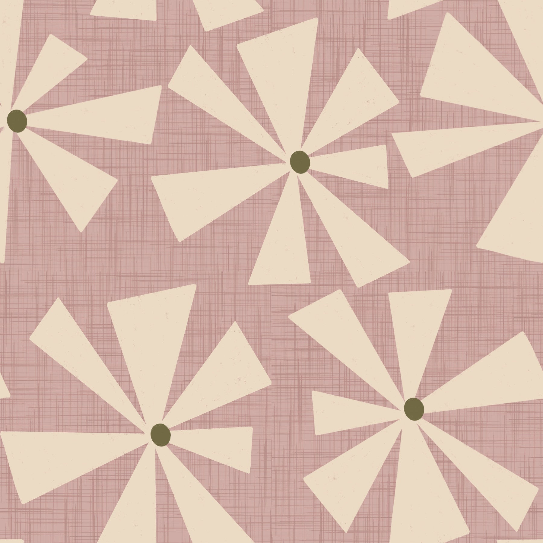 Retro-inspired wallpaper featuring pinwheel-style blooms in a soft pink mid-century design.