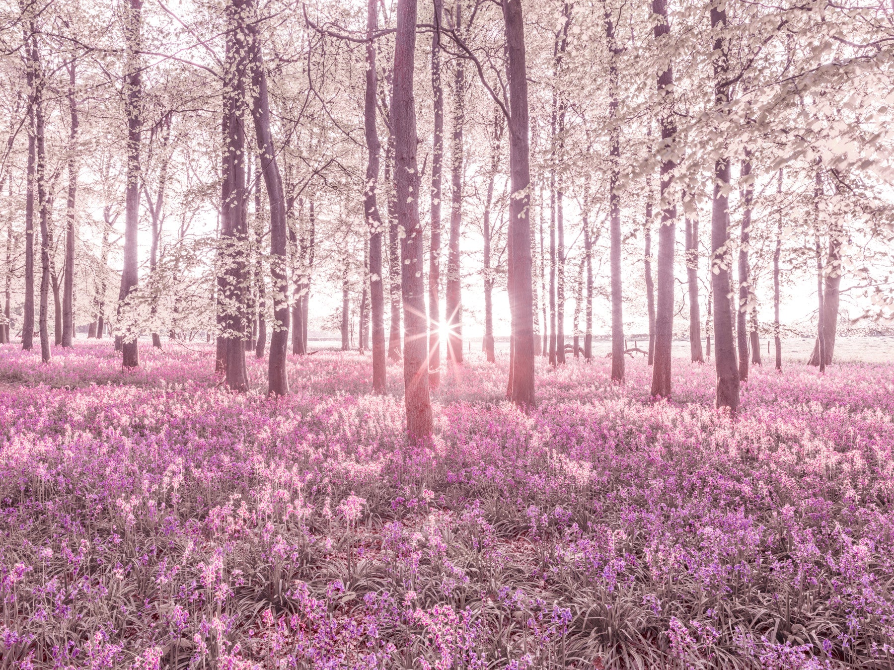 Bluebell forest. Bring an airy, floral dream into your home with this wallpaper. A luminous forest filled with pink and white blossoms invites serenity, while sunlight highlights the depth of the landscape. Perfect wallpaper for walls to brighten any room. This botanical scene works wonderfully in bedrooms or nurseries. The gentle colour palette and natural theme complements interiors, creating a sophisticated and calming effect. It’s a visual escape to an enchanted wood.