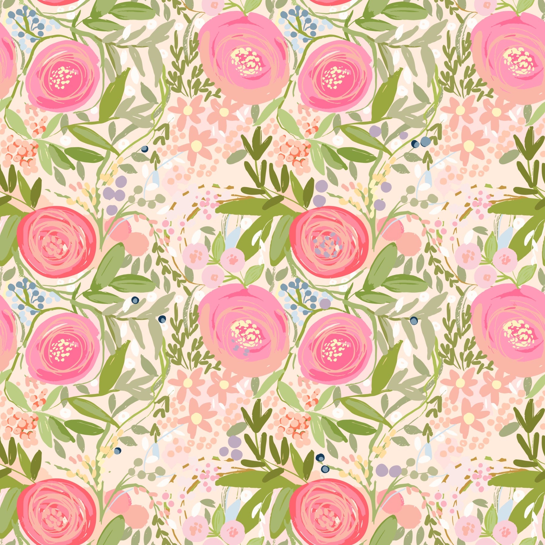 Introduce floral finesse with this Rosy Reverie wallpaper for walls. The design presents a beautiful garden with roses and smaller flowers. The colors are gentle pinks and greens, set against a soft beige background. The repeating pattern provides a continuous floral canvas. It perfectly suits a bedroom, creating a relaxing retreat. Consider its effect in a dining room, where it adds charm to your walls. This wallpaper can also transform a living room into an inviting space.