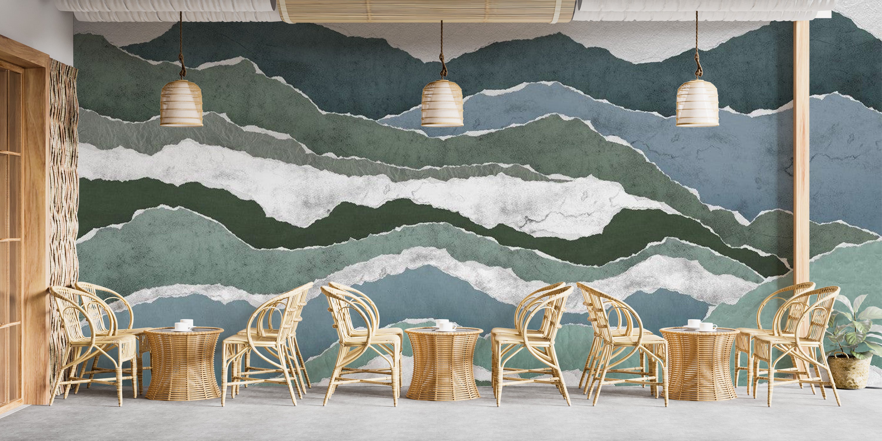 Discover the enchanting Royal Peaks watercolor mountain wallpaper mural. This mural features layered mountains in serene shades of green and blue, creating a stunning landscape for any room. Its unique watercolor design adds depth and character, making your walls come alive. Ideal for living rooms, bedrooms, and offices, this mural is an effortless way to infuse nature's beauty into your home. The detailed craftsmanship and artistic touch ensure that every glance offers a new perspective on its beauty. Embrace the artistry and quality of this watercolor mountain wallpaper. Its design resonates with nature lovers and art enthusiasts alike, providing a peaceful escape within your own walls.