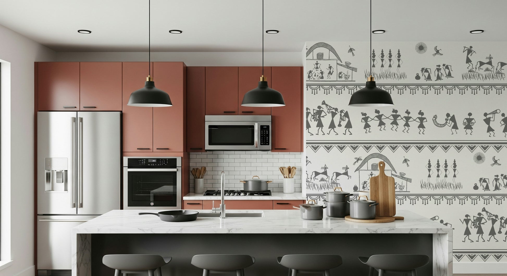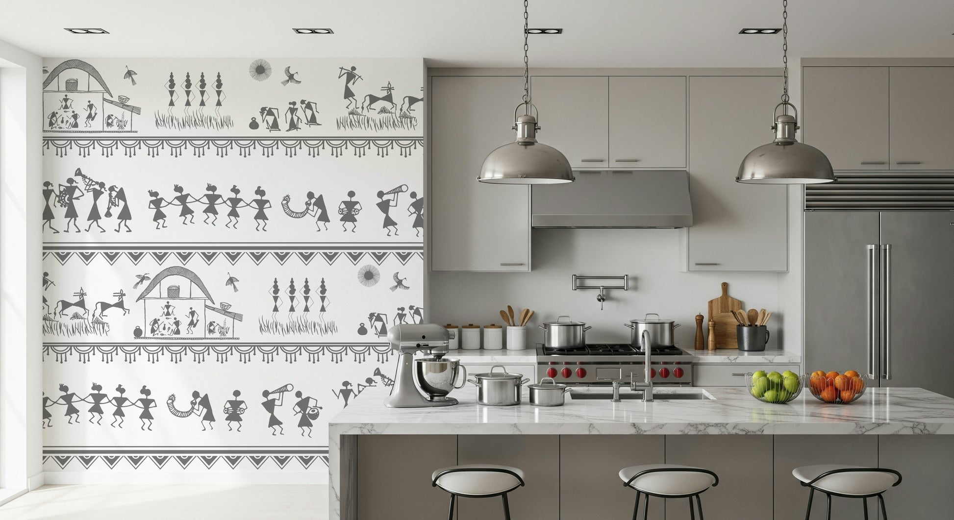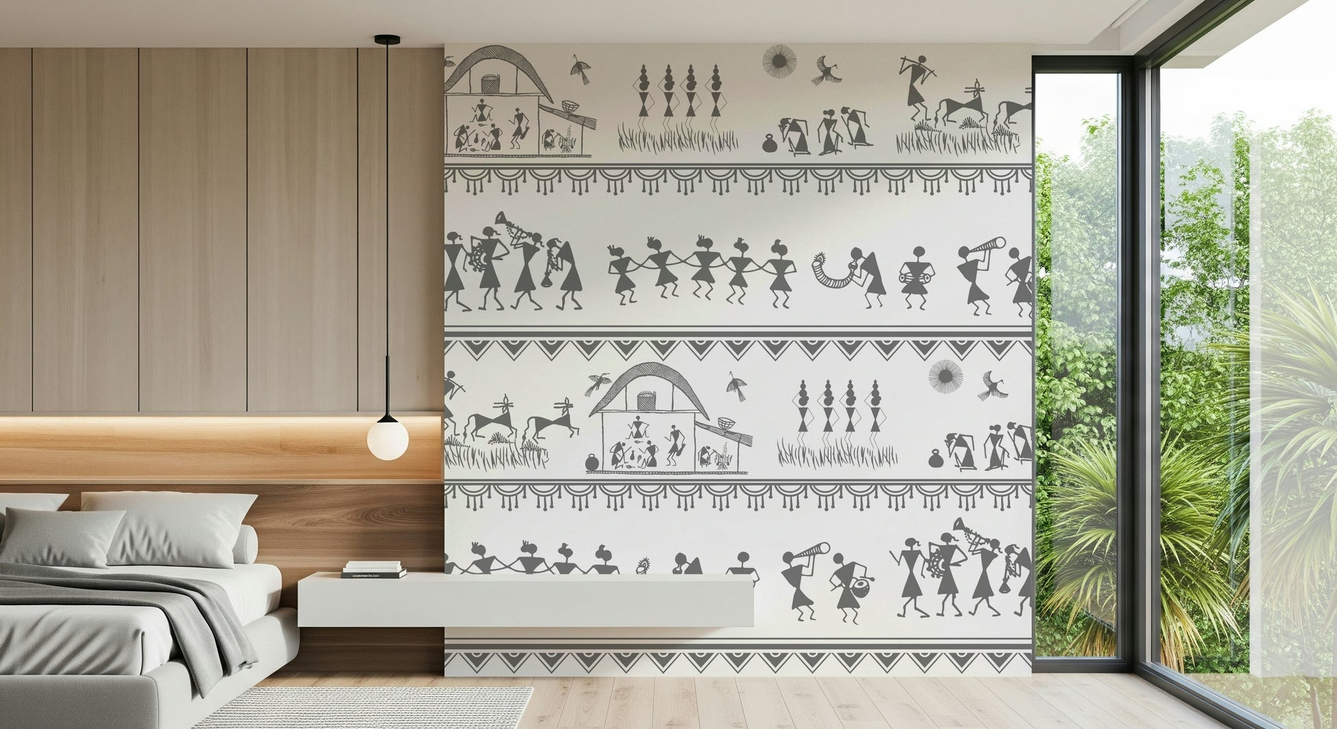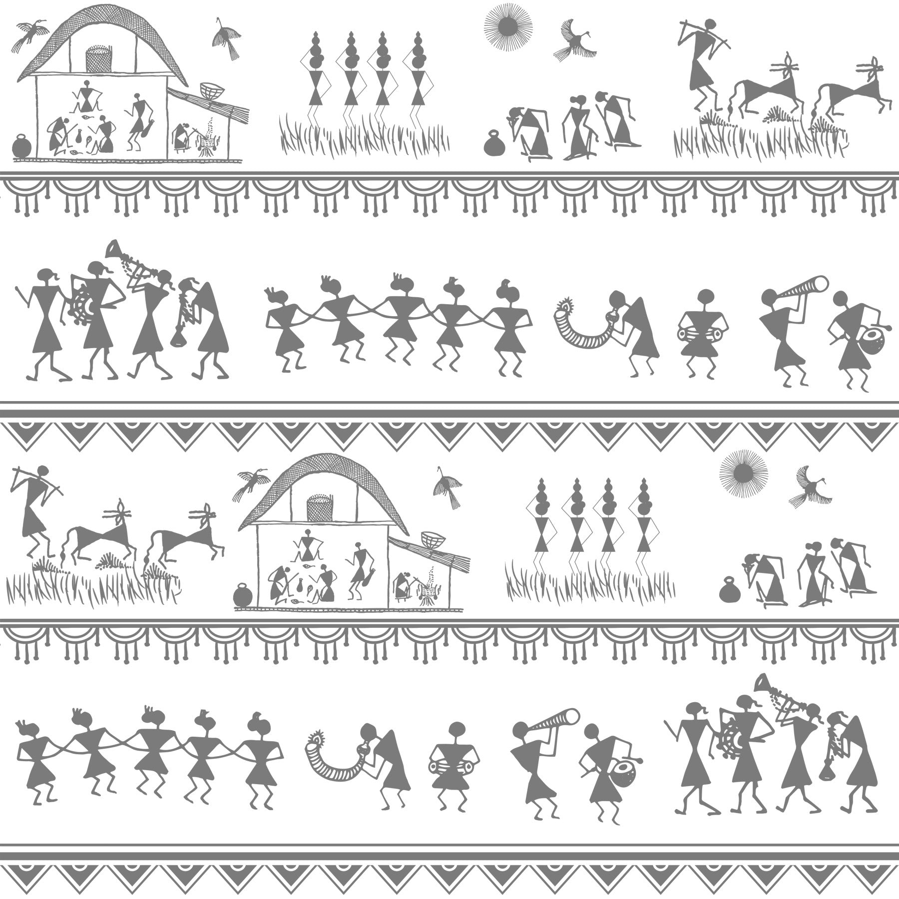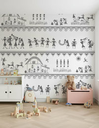 Immerse your space in the charming simplicity of "Rural Rhythm", a striking wall covering that captures the essence of village life. Echoing ancient artistic traditions, this design presents a delightful panorama of daily routines and festive celebrations. Observe the figures engaged in work around the hearth, the graceful movement of dancers, and the jubilant melodies produced by local musicians. This pattern is a celebration of community, heritage, and the natural world. Bring home this piece of art, and let your walls share stories of warmth, connection, and the timeless beauty of the countryside. Its monochromatic palette and unique design make it a captivating focal point for any room, adding a touch of rustic elegance and cultural richness to your wall décor.