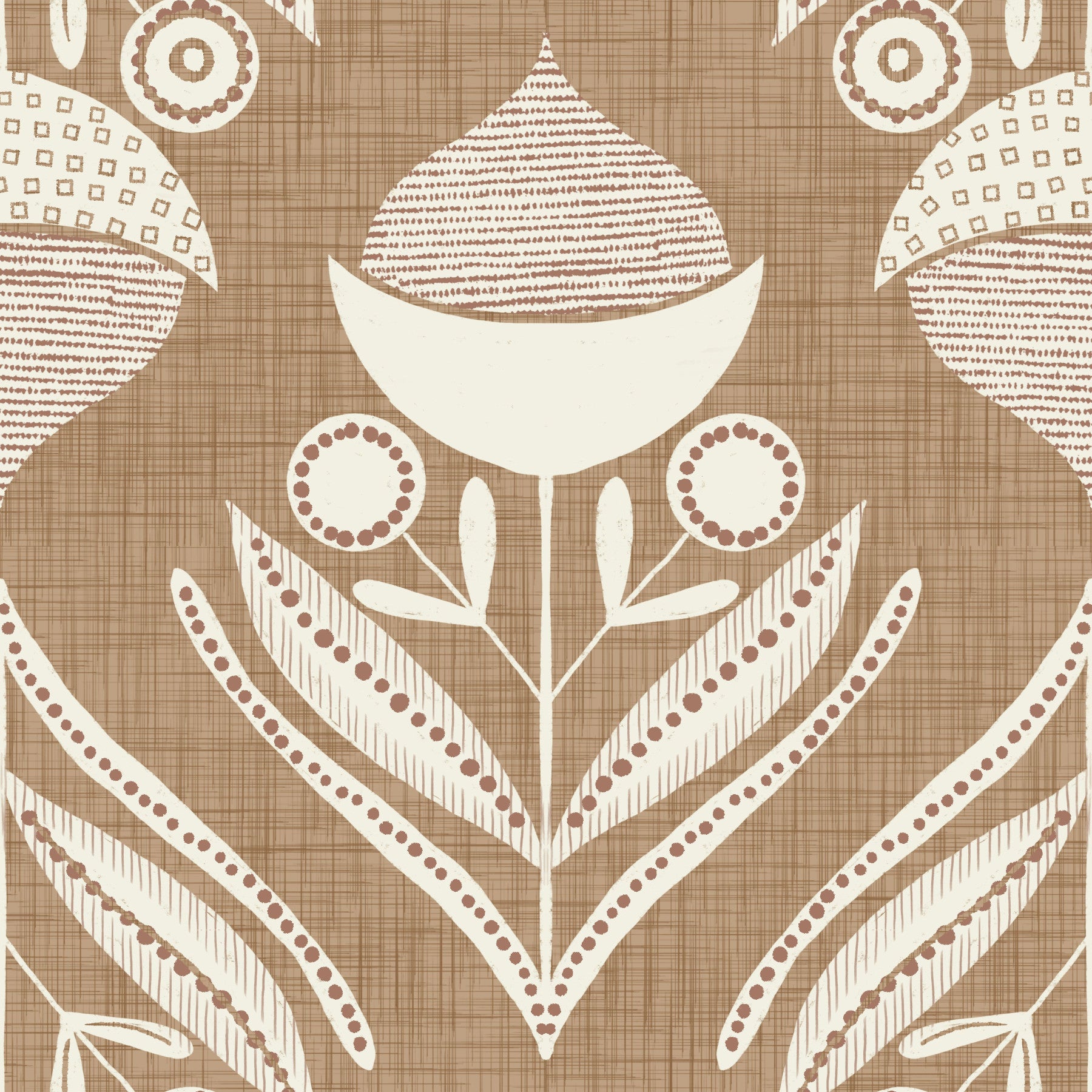 Stylized botanical pattern with symmetrical blooms and curved leaves in cream over a rustic brown base