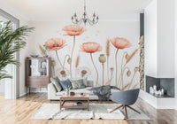 Transform any space into a tranquil haven with this rustic floral wallpaper. Warm tones of coral poppies and wheat provide an inviting backdrop for relaxation and comfort. This wallpaper for walls design incorporates delicate watercolour textures, perfect for bedrooms, nurseries, and living spaces. The gentle colour palette creates a harmonious and relaxing atmosphere. Complement your interior with nature-inspired elegance, turning any room into a peaceful sanctuary. The subtle, painterly details enhance the aesthetic of modern farmhouse, cottagecore, and classic design schemes. Enhance walls and create a focal point with this artful composition.