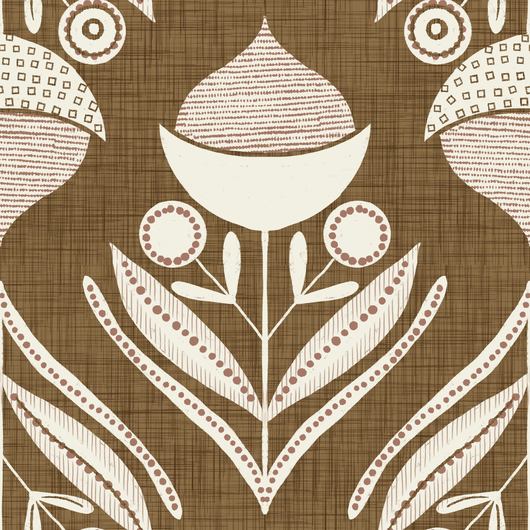 Folk-art wallpaper mural with cream and muted pink florals set against a textured brown backdrop.