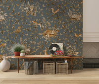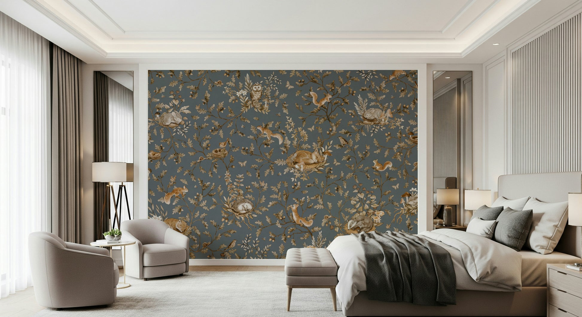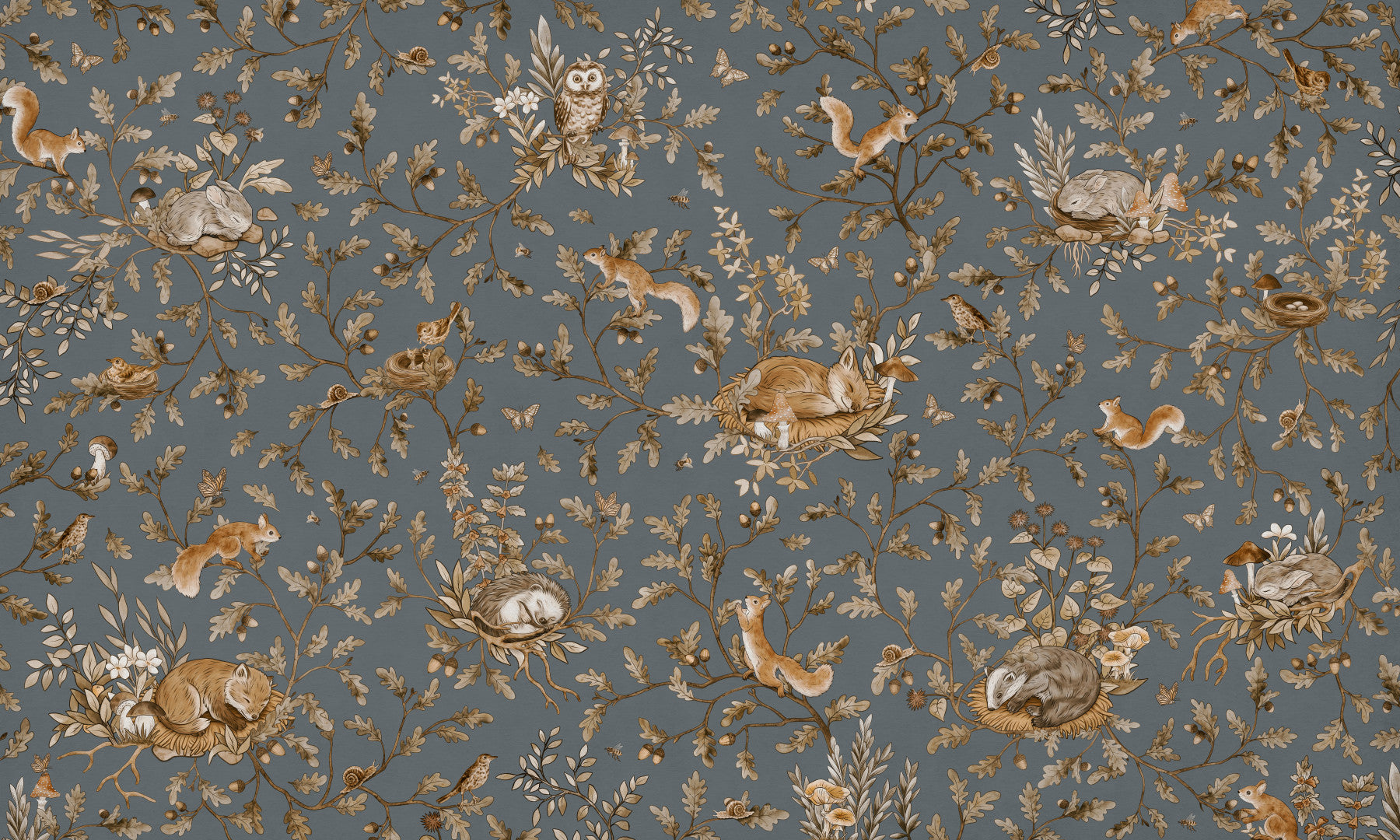 Elevate your home with this vintage animal wallpaper. Explore the delicate details showcasing charming forest inhabitants like squirrels, foxes, and owls amongst stylised oak branches. Earthy browns on a muted grey-blue ground cultivate a rustic and cosy ambience. This wallpaper for walls works well in living rooms, bedrooms, and nurseries. It enriches interiors with a storybook elegance and provides a calming vibe to any room.