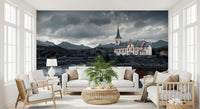 Church in Lofoten, Norway. Invite tranquility into your space with 'Sacred Shores,' a captivating piece that evokes a sense of peace and reverence. This imagery portrays a serene coastal landscape dominated by a striking church nestled amidst rugged mountains and reflective waters. The dramatic interplay of light and shadow, coupled with the muted colour palette, creates an atmosphere of quiet contemplation. The detailed architecture of the building and its reflection mirrored in the calm waters, adds to the allure, suggesting stories of faith and resilience. Embrace this exquisite scene, transforming your wall into a sanctuary of serenity and timeless beauty.