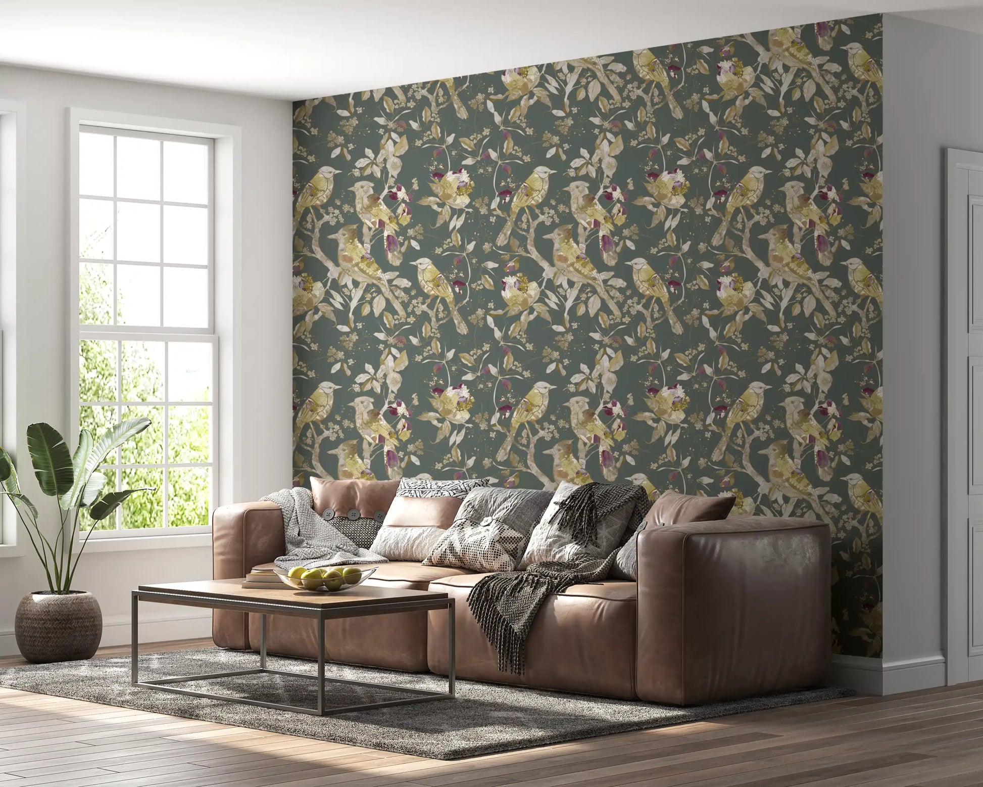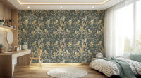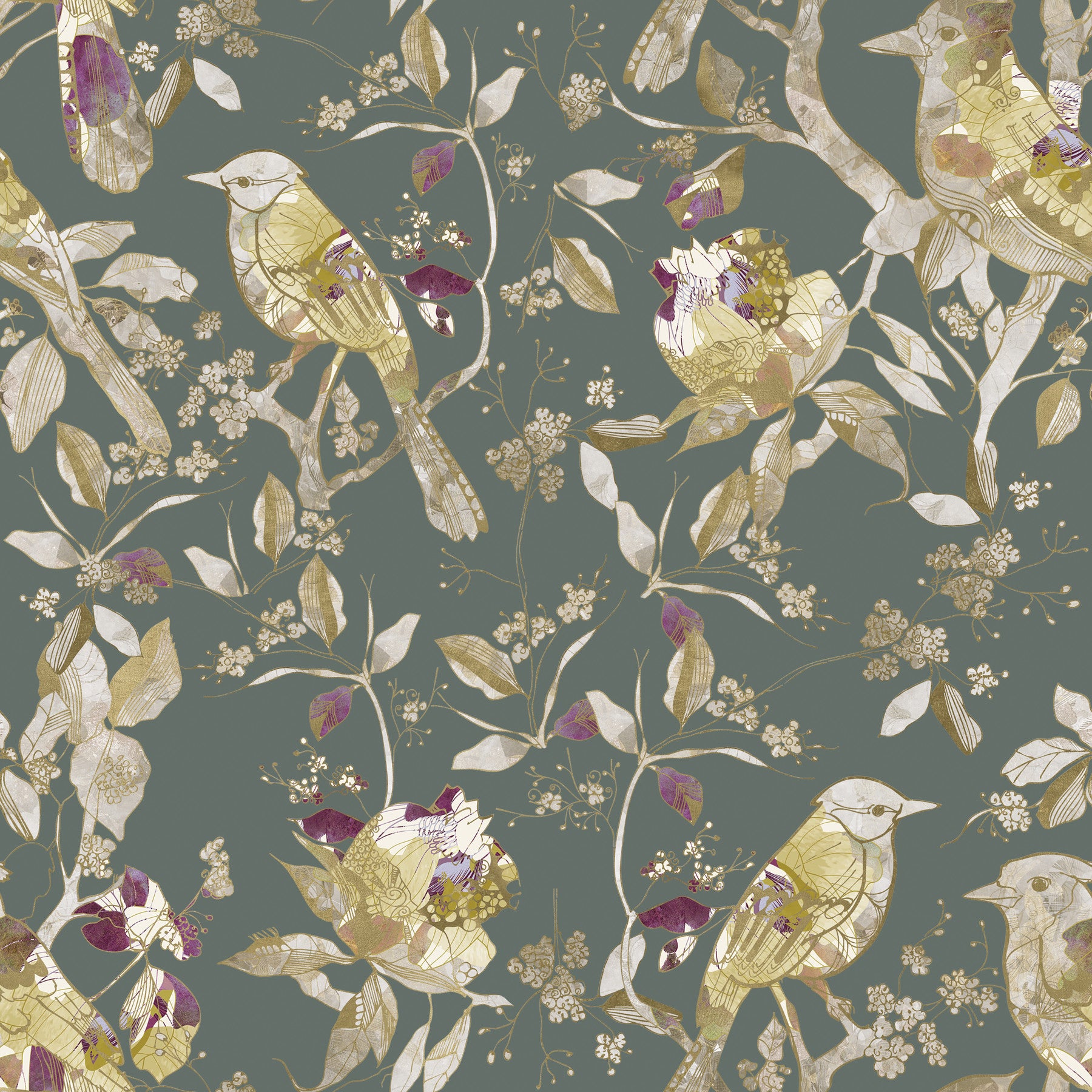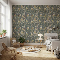 Immerse your living space in tranquil elegance with our Sage Green Botanical Bird wallpaper. This enchanting design features a serene sage green backdrop, providing the perfect canvas for a symphony of nature-inspired artistry. Graceful birds, stylised with intricate patterns in soft golds, creams, and gentle yellows, perch amidst a delicate tapestry of botanical elements. Delicate leaves and blossoming sprigs, rendered with a beautiful metallic-like sheen, intertwine across the surface, creating depth and visual interest. Subtle accents of rich plum hues dot the foliage, adding an unexpected touch of sophisticated warmth. This exquisite wall decor transforms any room into a peaceful sanctuary, inviting the timeless beauty of an enchanted garden indoors. Ideal for crafting an atmosphere of refined calm and natural charm, it's a statement of serene sophistication.