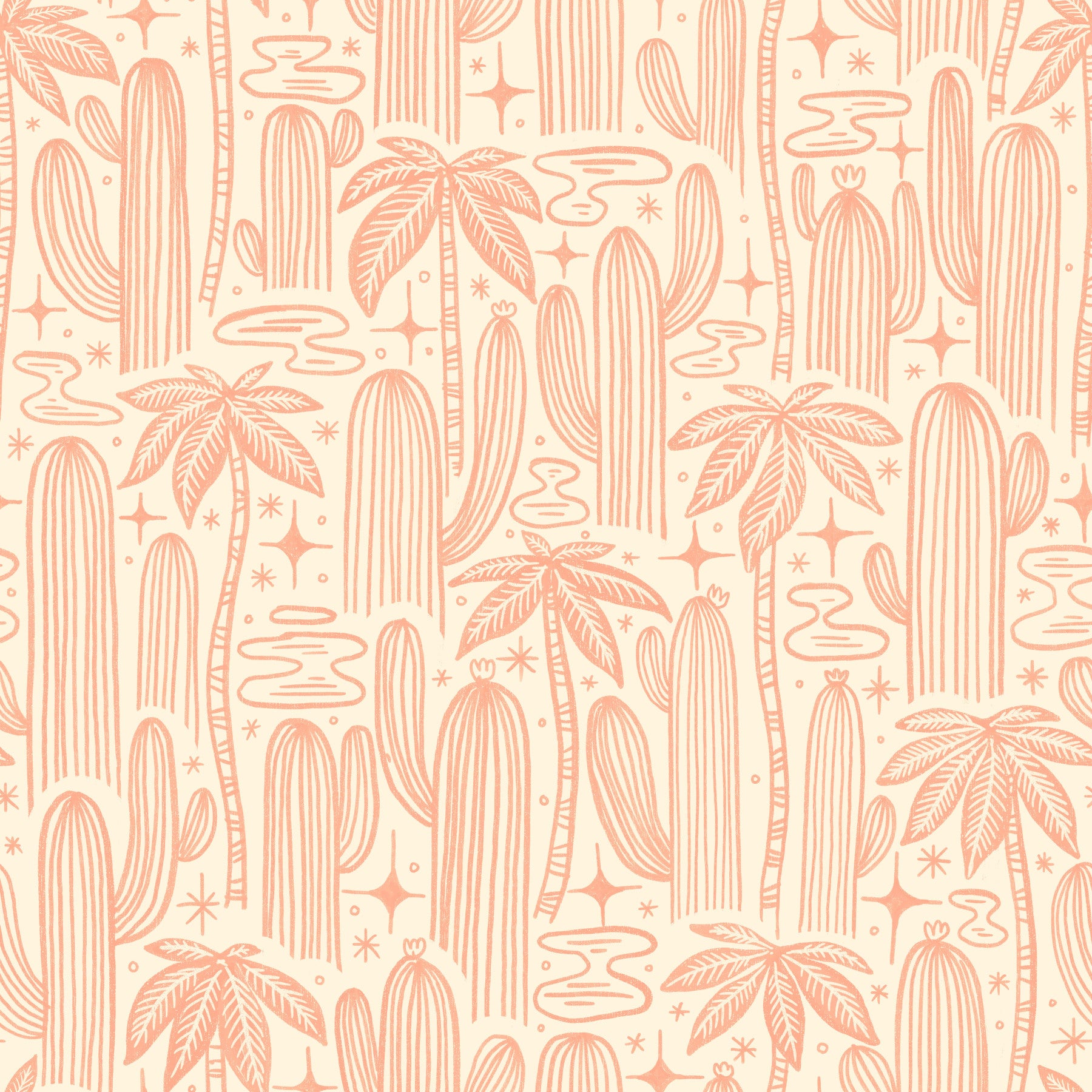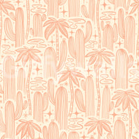 Bathed in an off-white glow, this wallpaper design features a captivating arrangement of stylized saguaro cacti and palm trees. Delicate, peach-toned line art creates a serene and minimalist aesthetic. Scattered stars and abstract pools of water add a touch of celestial magic and desert oasis charm. The hand-drawn feel provides a unique texture and warmth, making it perfect for adding a touch of southwestern elegance to any digital device. This wallpaper evokes a calming, dreamlike desert landscape under a starlit sky, ideal for those seeking a tranquil and sophisticated digital backdrop.