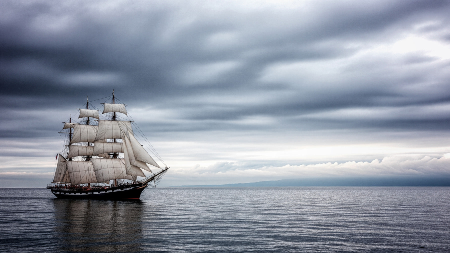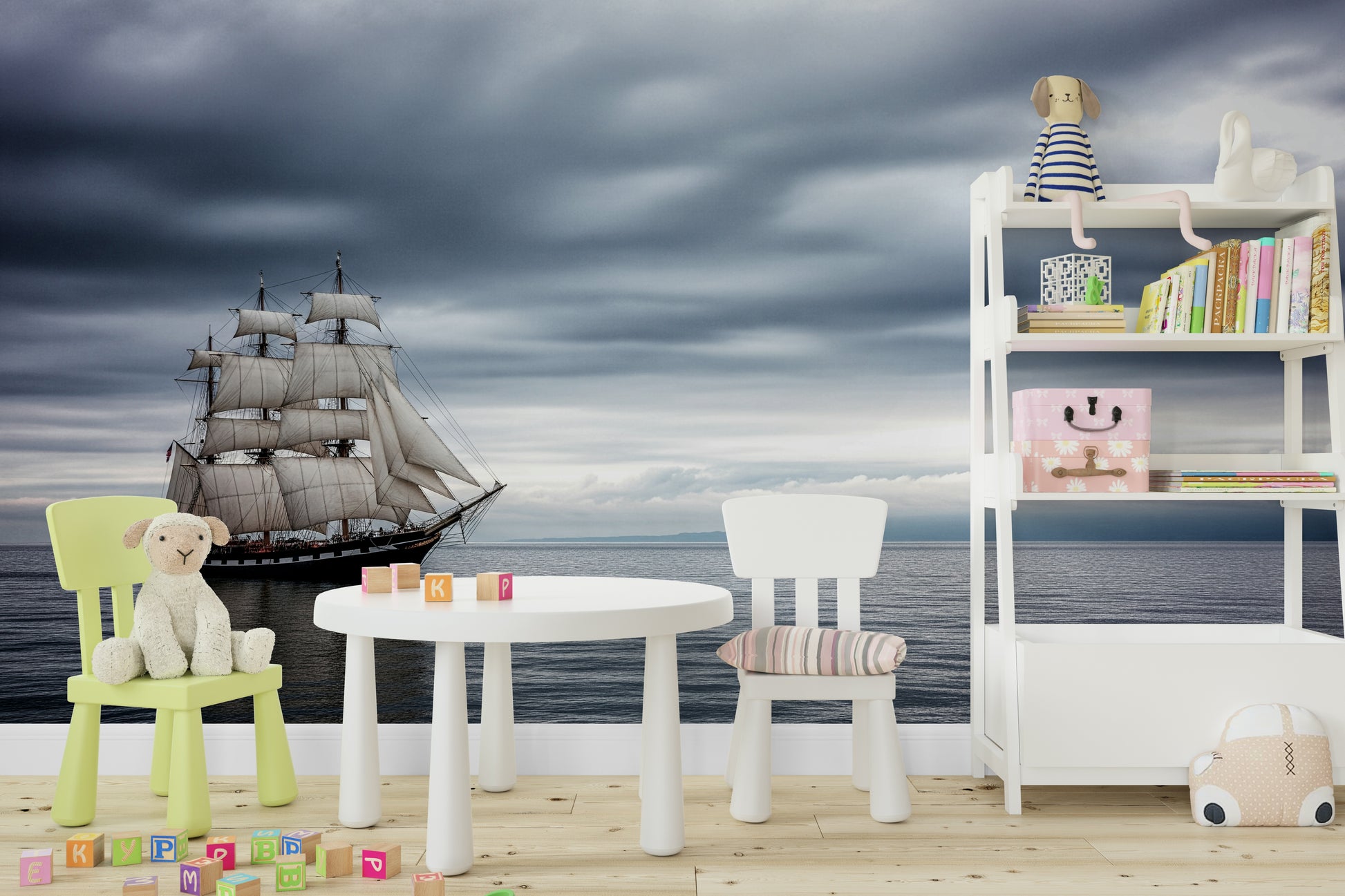 Embrace the call of the open sea with this striking wallpaper for walls. A majestic tall ship sails beneath a dramatic sky, evoking a sense of wonder and exploration. The muted colors enhance the scene's peaceful atmosphere, suitable for bedrooms or a home office. The detailed rendering complements minimalist or traditional interiors. Add a touch of maritime history to any room.