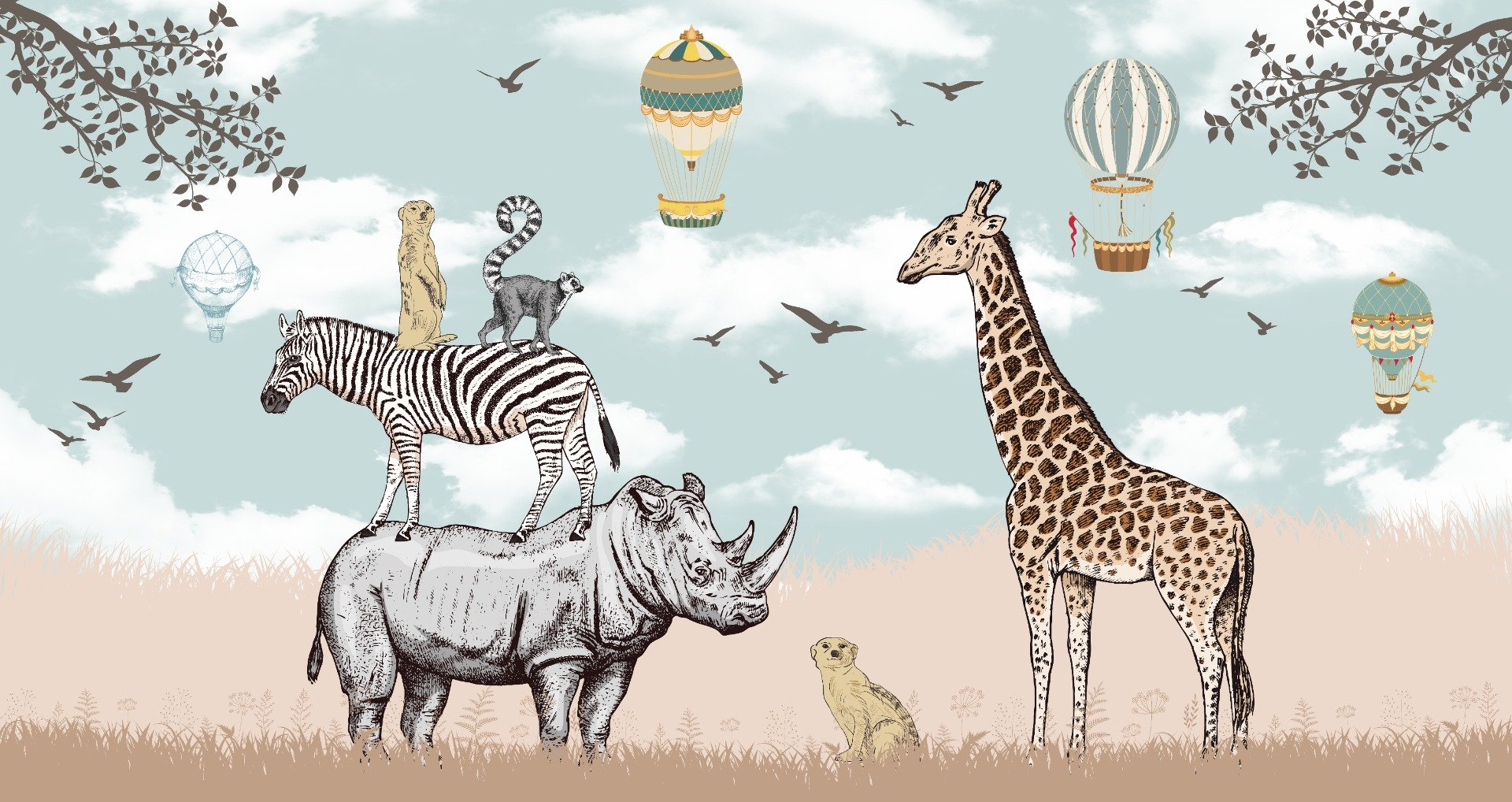 This savannah animals kids room mural wallpaper brings the magic of the African savannah directly into your childs room. The design features a vibrant and colourful depiction of friendly animals like giraffes, elephants, lions, and zebras, playfully interacting in their natural habitat. The lively scenes are perfect for sparking imagination and wonder in any young explorer. The wallpaper is crafted with durable materials, ensuring it withstands the energetic play of children. Its easy-to-clean surface makes maintenance a breeze for busy parents. Ideal for creating a fun and educational environment, this animal themed wallpaper is a delightful choice for a nursery, playroom, or bedroom. Its joyful design not only decorates the room but also encourages learning about wildlife and nature, making it a perfect blend of playfulness and practicality.