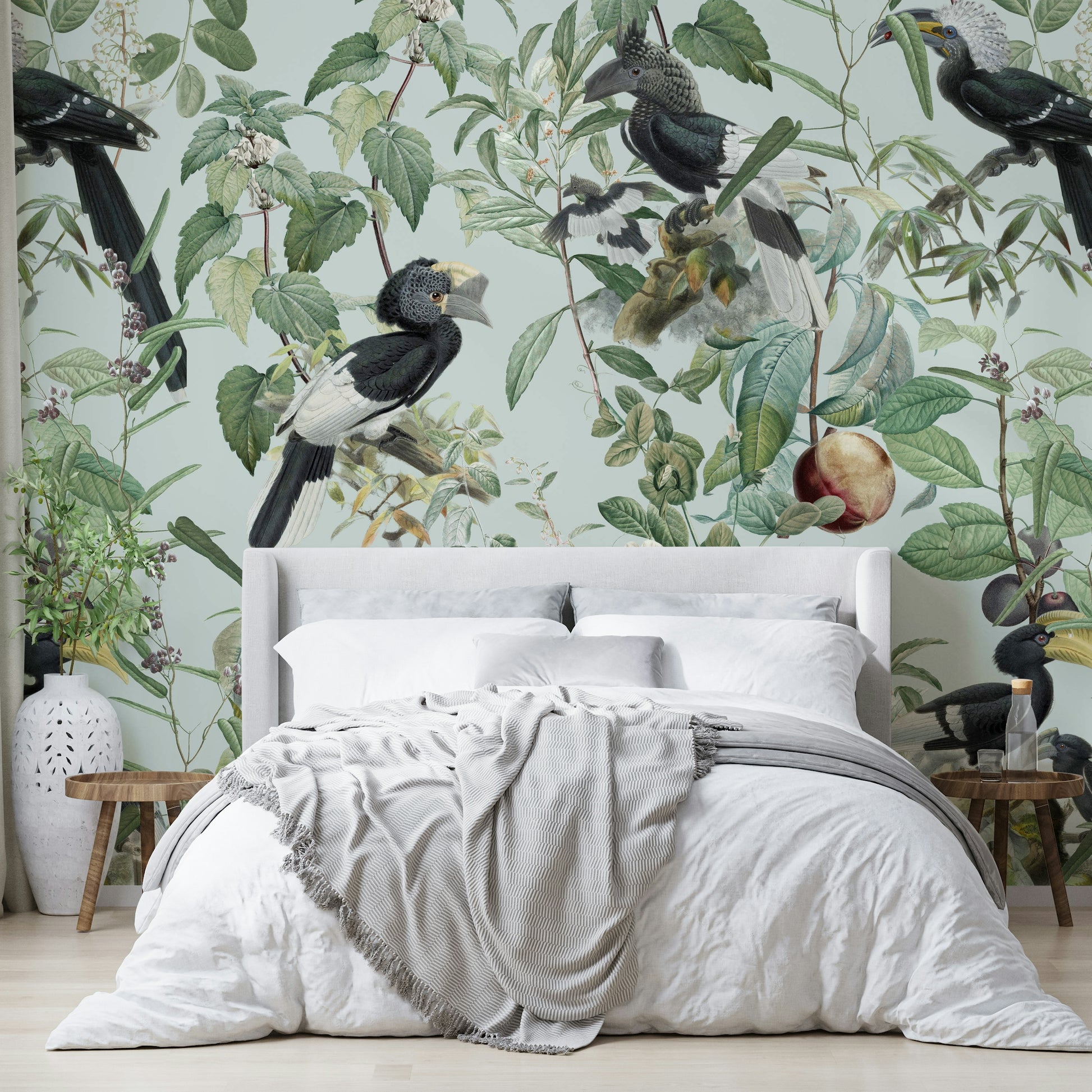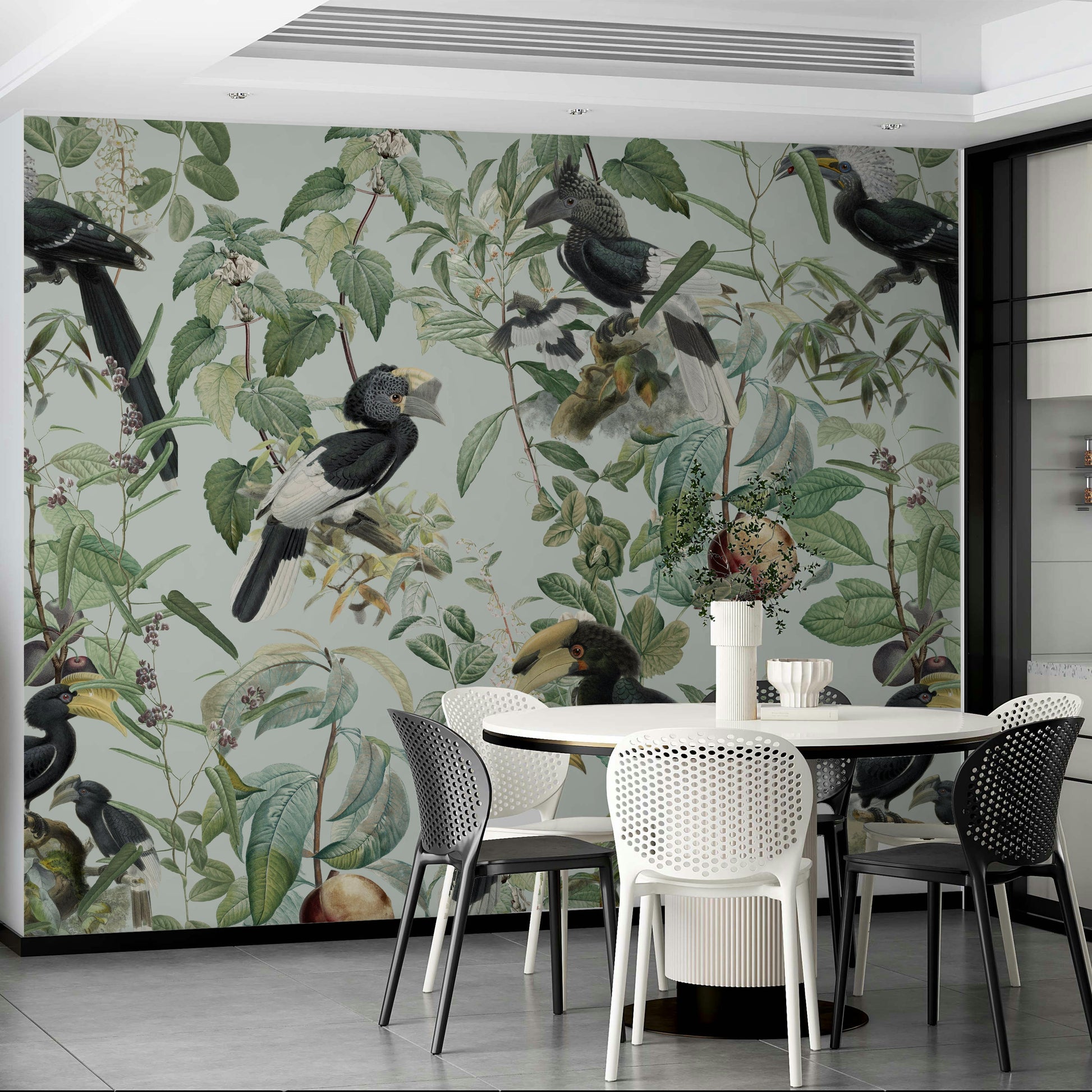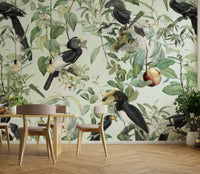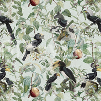 Immerse yourself in the vibrant tapestry of 'Savannah Full'. This wallpaper showcases a breathtaking profusion of lush foliage, delicate blossoms, and striking hornbills, all rendered in a captivating vintage botanical style. Peaches and other fruits add pops of color against the soft, muted background. The intricate details and realistic portrayal of the birds create a sense of serene wildness, perfect for bringing the beauty and tranquility of the African savanna to your digital space. The wallpaper's seamless pattern ensures a cohesive and visually stunning effect, ideal for desktops, laptops, or mobile devices.