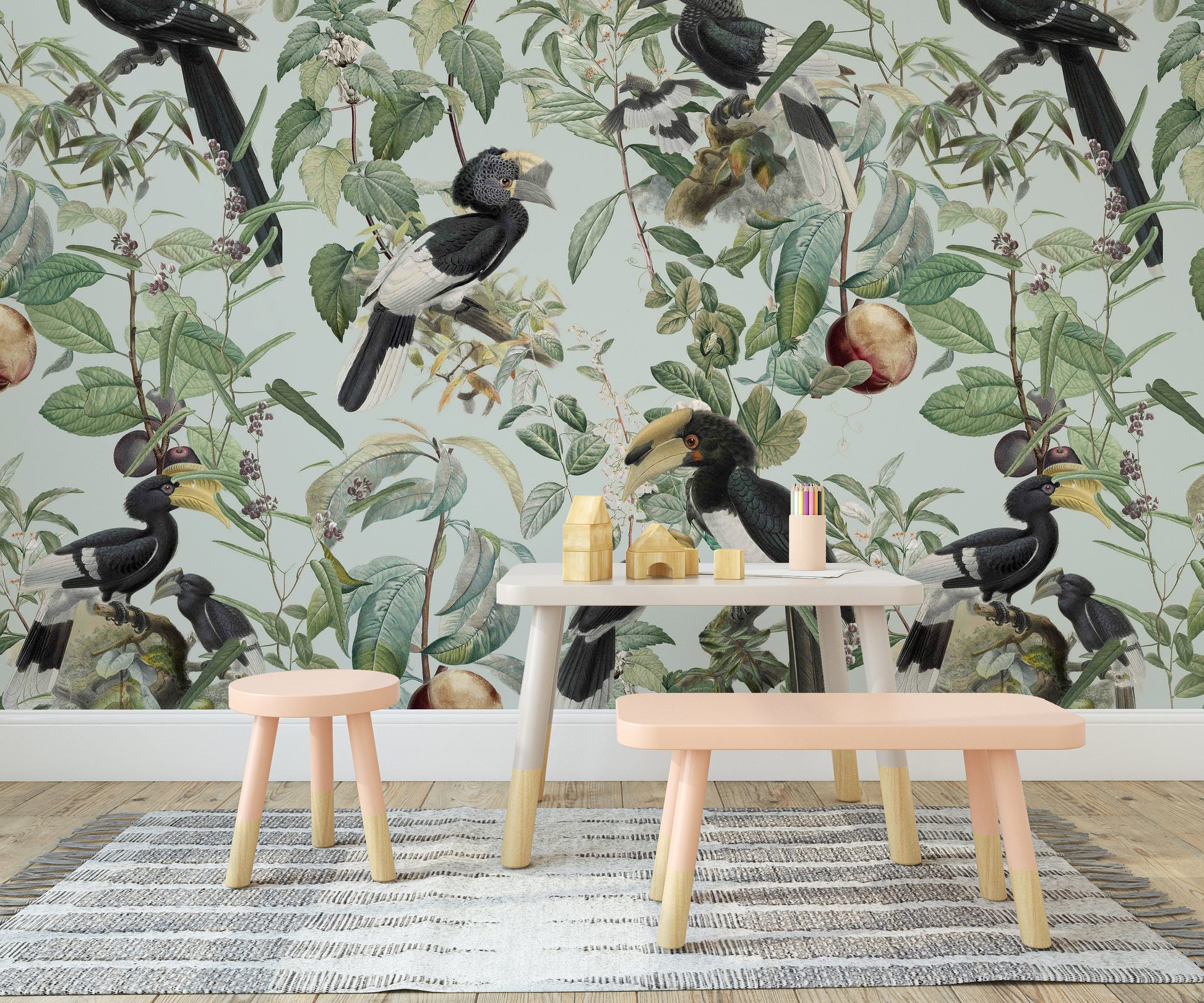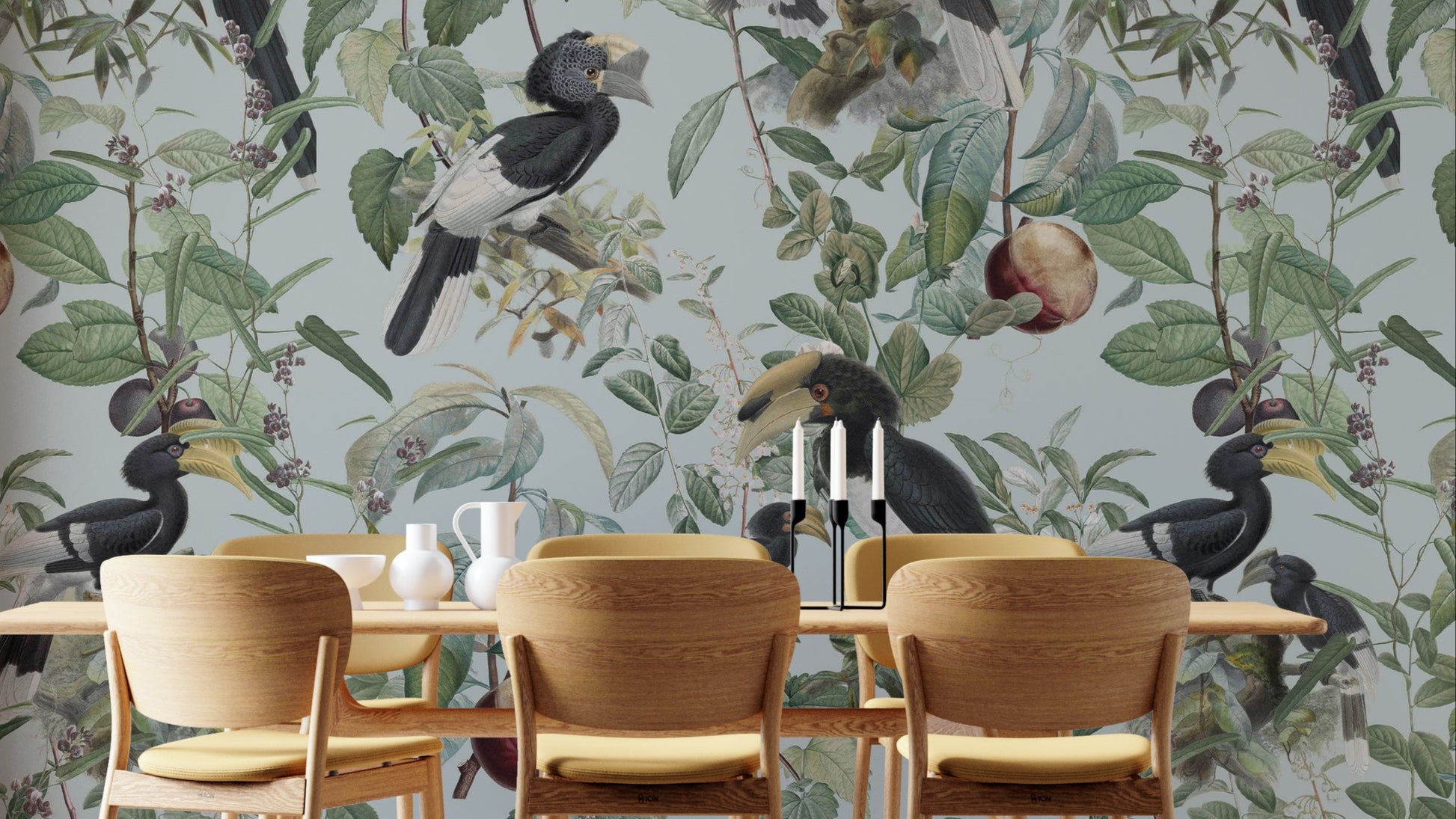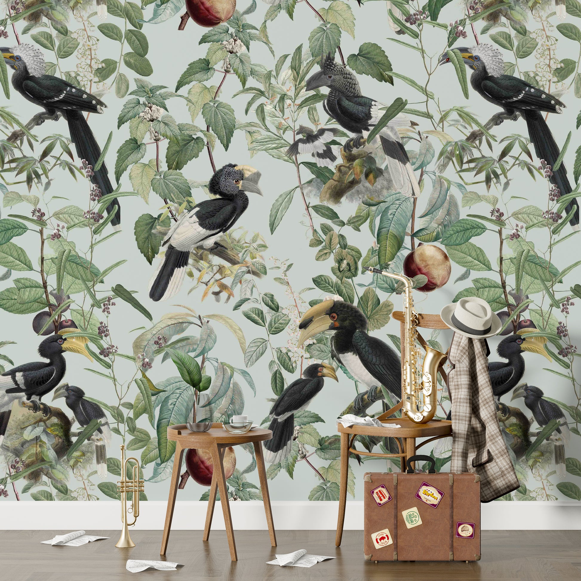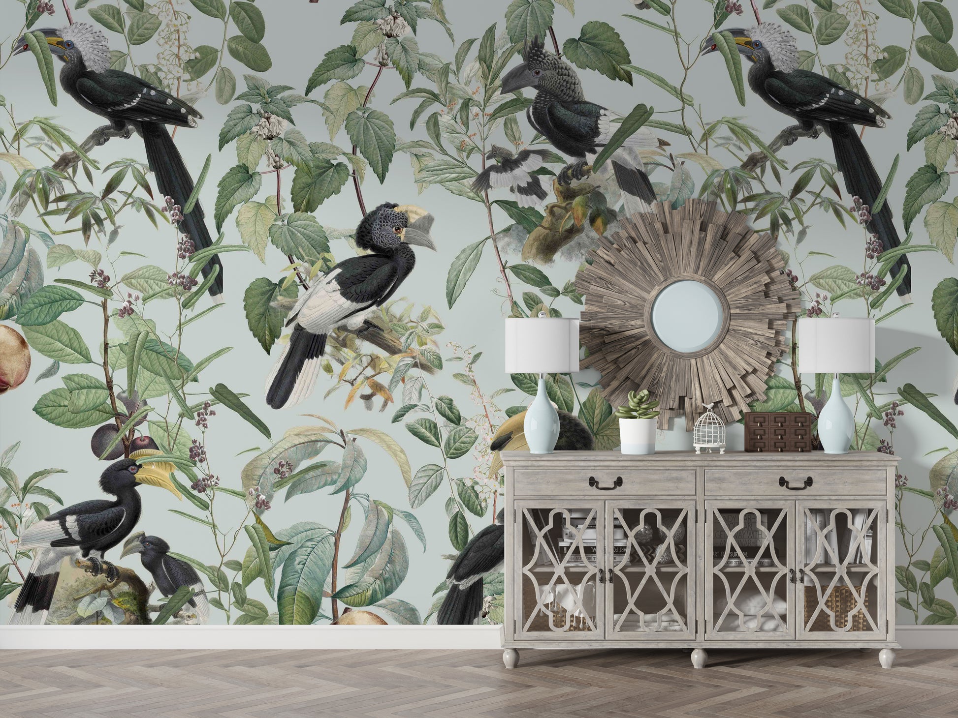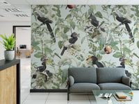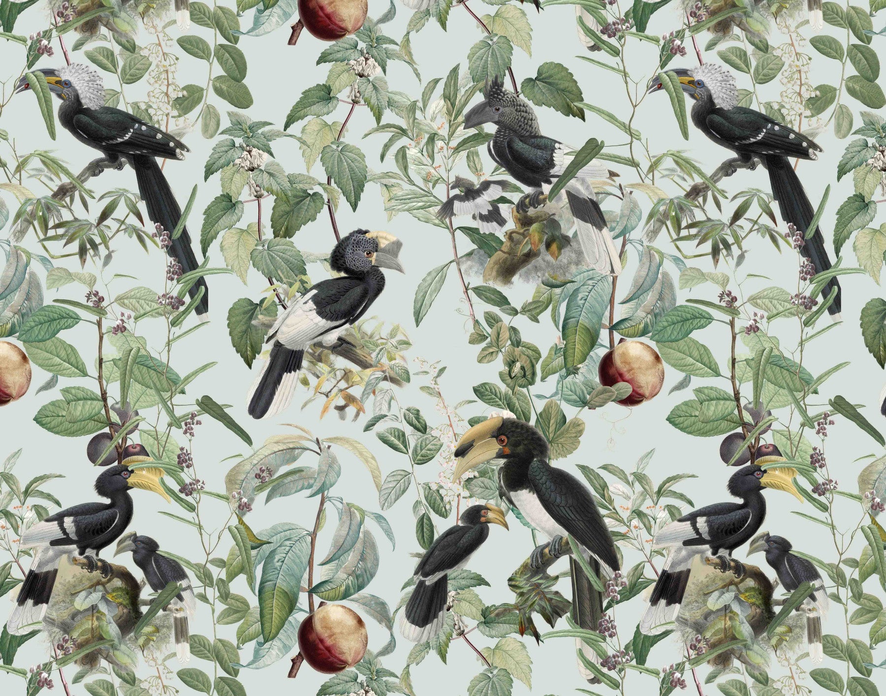 Immerse yourself in the lush abundance of "Savannah Full", a wallpaper that celebrates nature's bounty. Exotic birds, prominently featuring hornbills with their distinctive beaks and plumage, are artfully arranged amongst a dense tapestry of verdant leaves, delicate blossoms, and ripe fruits. The soft, muted pastel background evokes a vintage botanical illustration, creating a serene and sophisticated atmosphere. This wallpaper brings the vibrant yet tranquil essence of the African savannah to your space, offering a unique blend of wildlife artistry and timeless elegance. Perfect for adding a touch of natural wonder to any room.