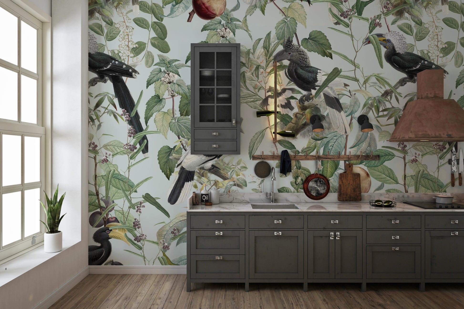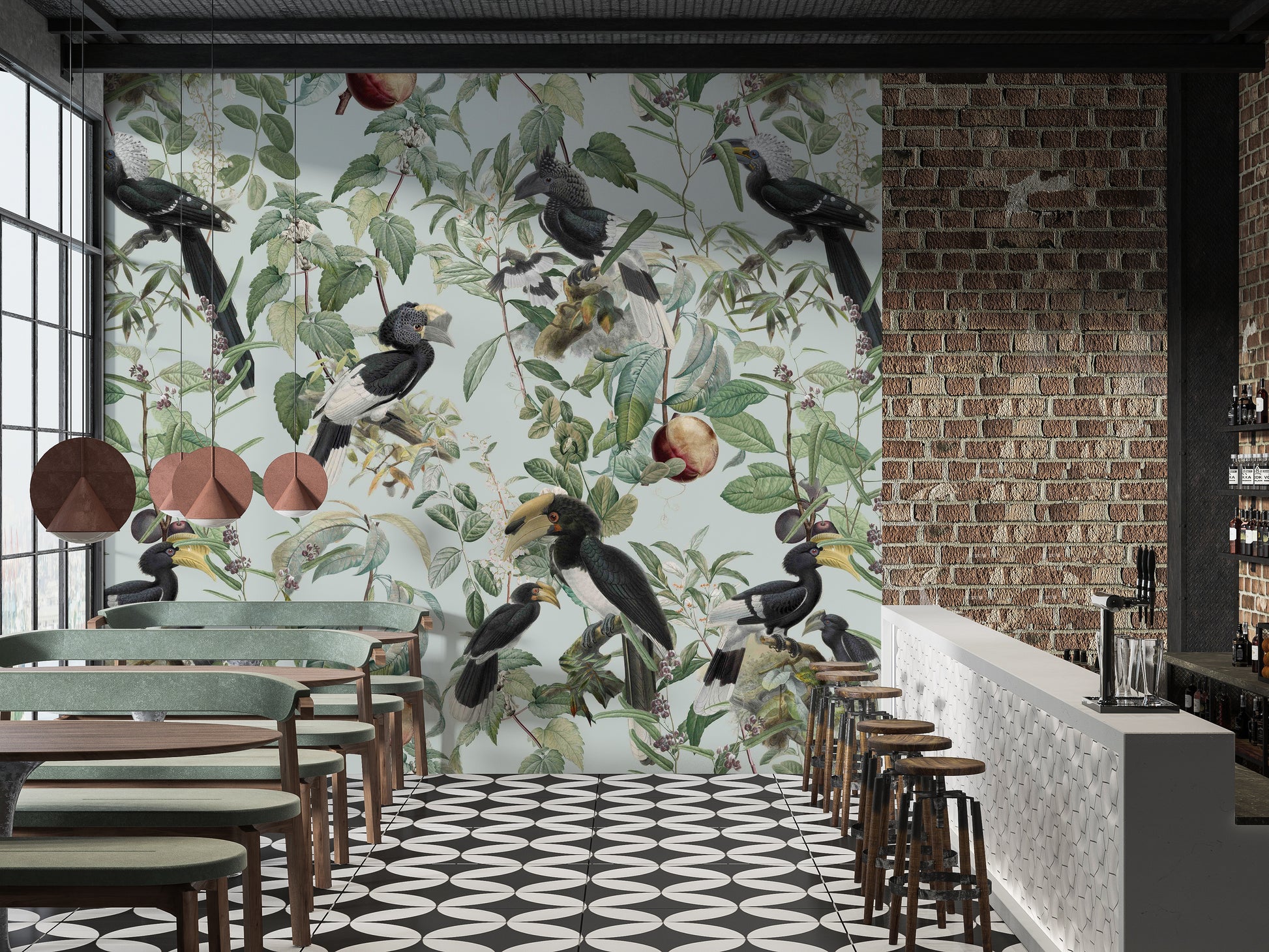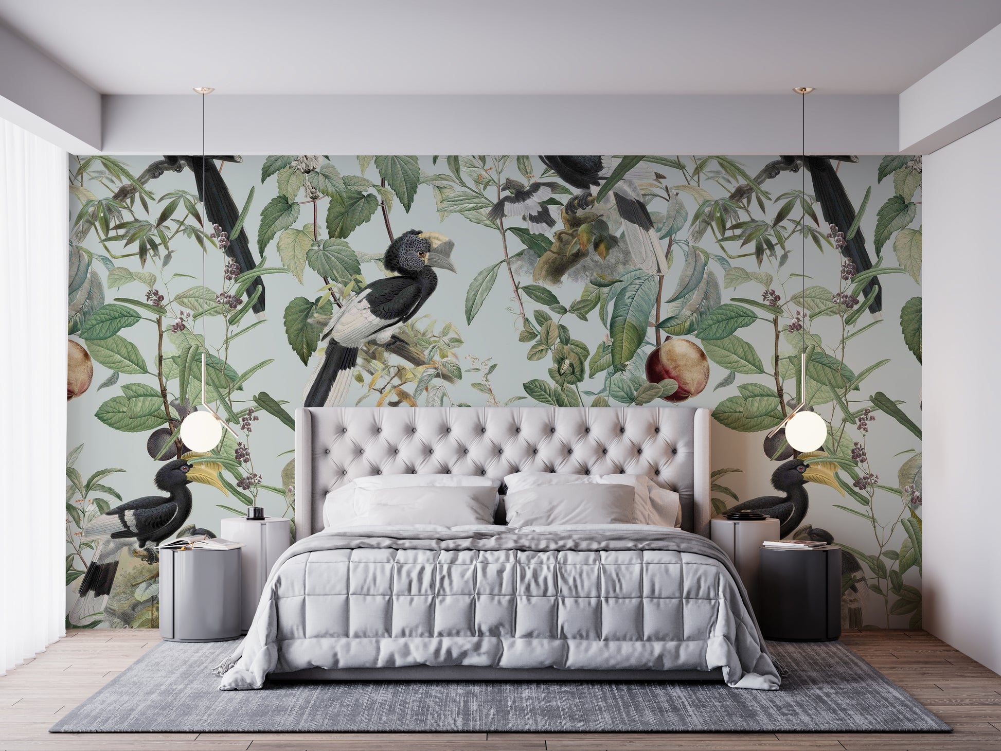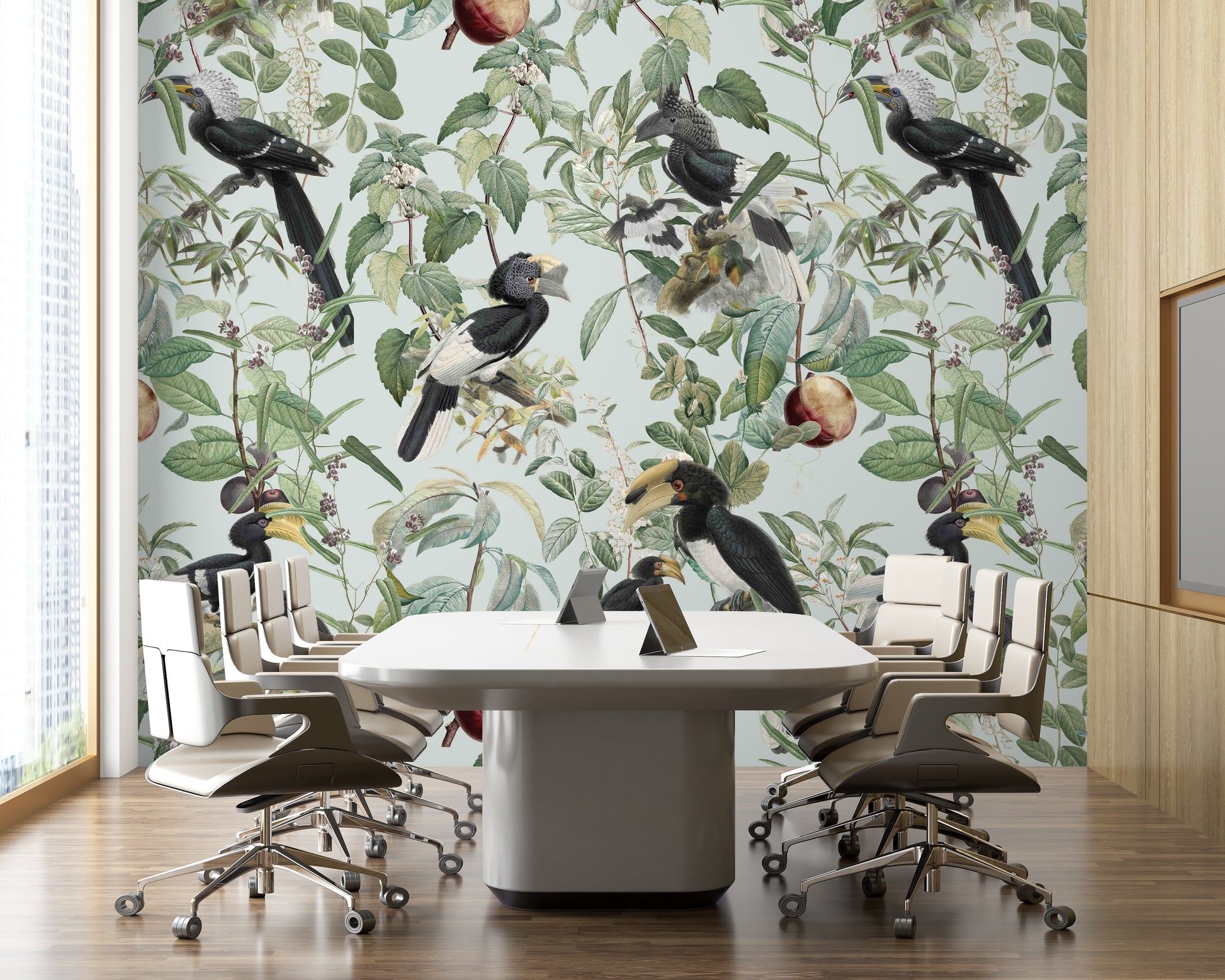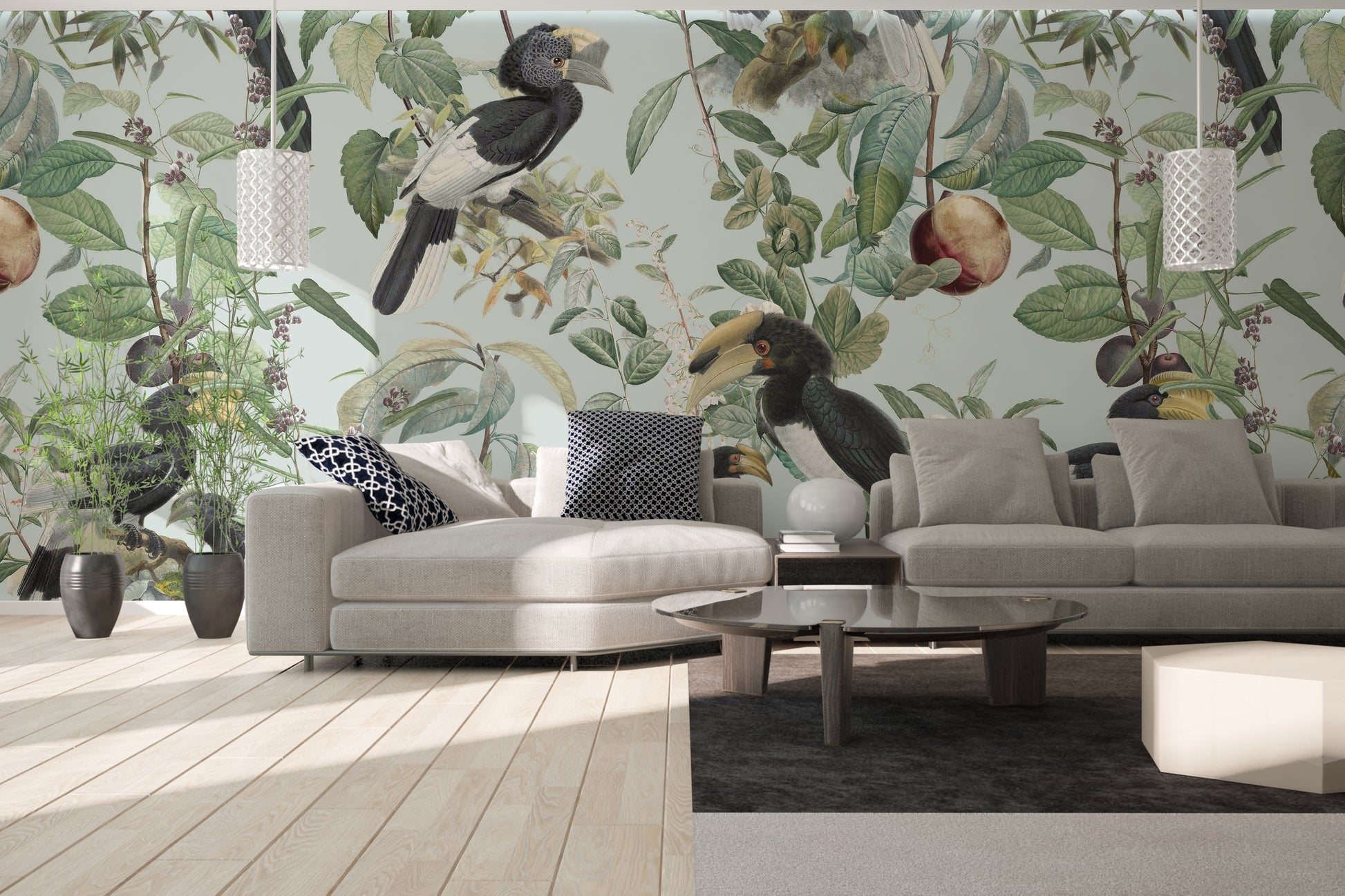 Immerse yourself in the lush abundance of "Savannah Full", a wallpaper that celebrates nature's bounty. Exotic birds, prominently featuring hornbills with their distinctive beaks and plumage, are artfully arranged amongst a dense tapestry of verdant leaves, delicate blossoms, and ripe fruits. The soft, muted pastel background evokes a vintage botanical illustration, creating a serene and sophisticated atmosphere. This wallpaper brings the vibrant yet tranquil essence of the African savannah to your space, offering a unique blend of wildlife artistry and timeless elegance. Perfect for adding a touch of natural wonder to any room.