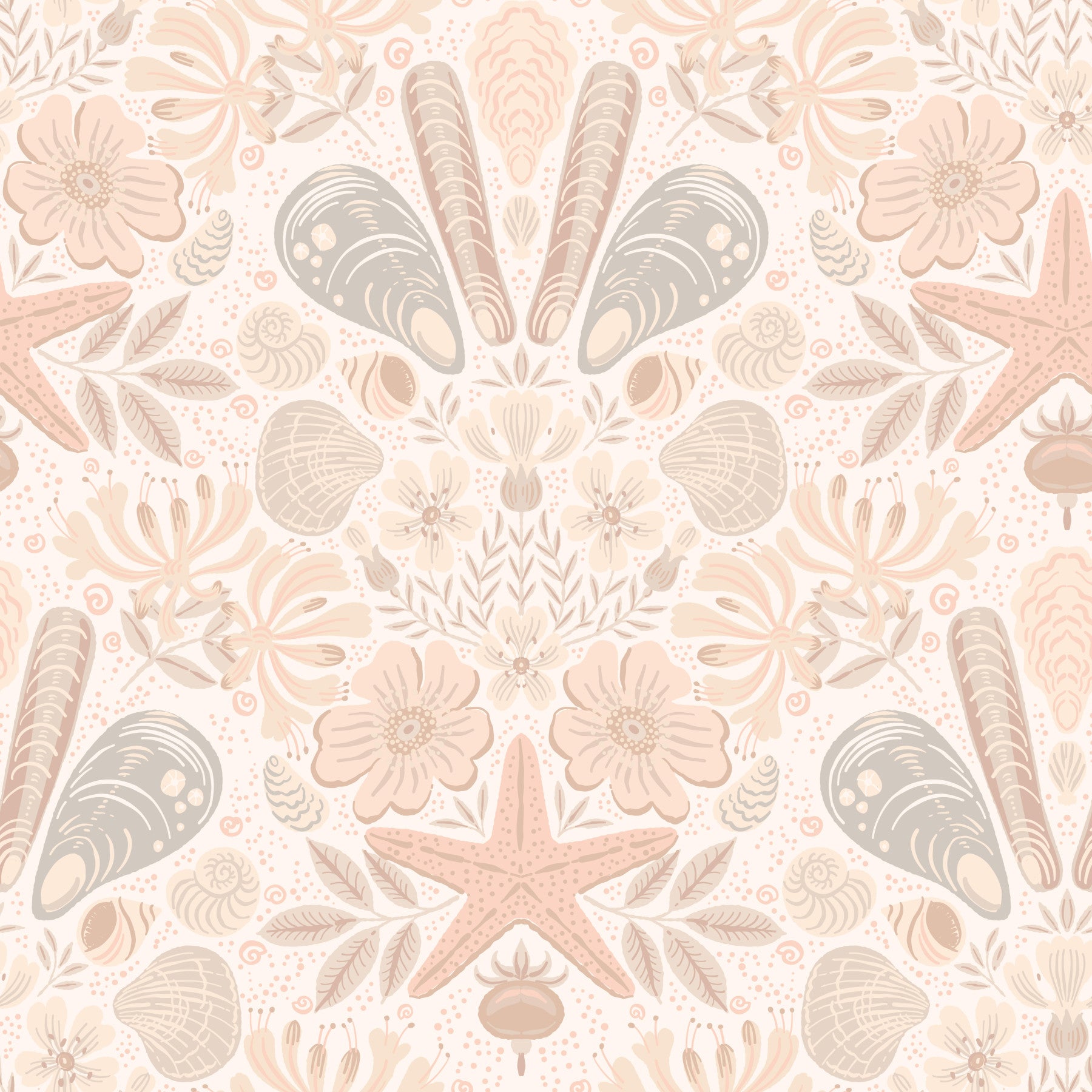 Embrace the serene beauty of the Scandinavian coast with this wallpaper. Delicate blush pink and muted grey tones create a calming atmosphere, showcasing a whimsical damask pattern infused with beach flora and fauna. Seashells, starfish, and honeysuckle flowers intertwine in a harmonious design, evoking a sense of tranquil coastal charm. The soft color palette and intricate detailing offer a sophisticated yet relaxed aesthetic, perfect for creating a peaceful and stylish space. This wallpaper seamlessly blends the elegance of Scandinavian design with the carefree spirit of the beach, bringing a touch of seaside serenity to your digital world.