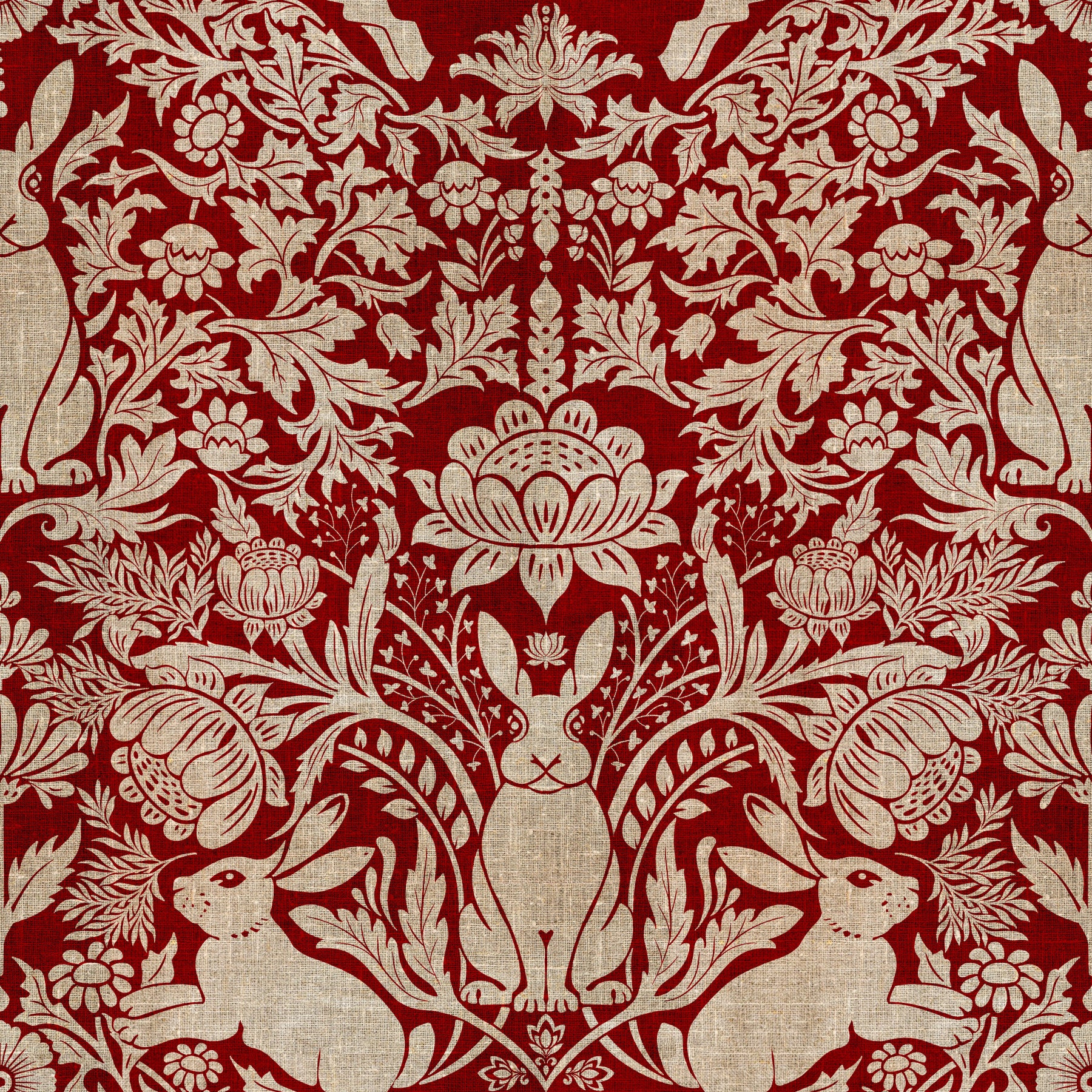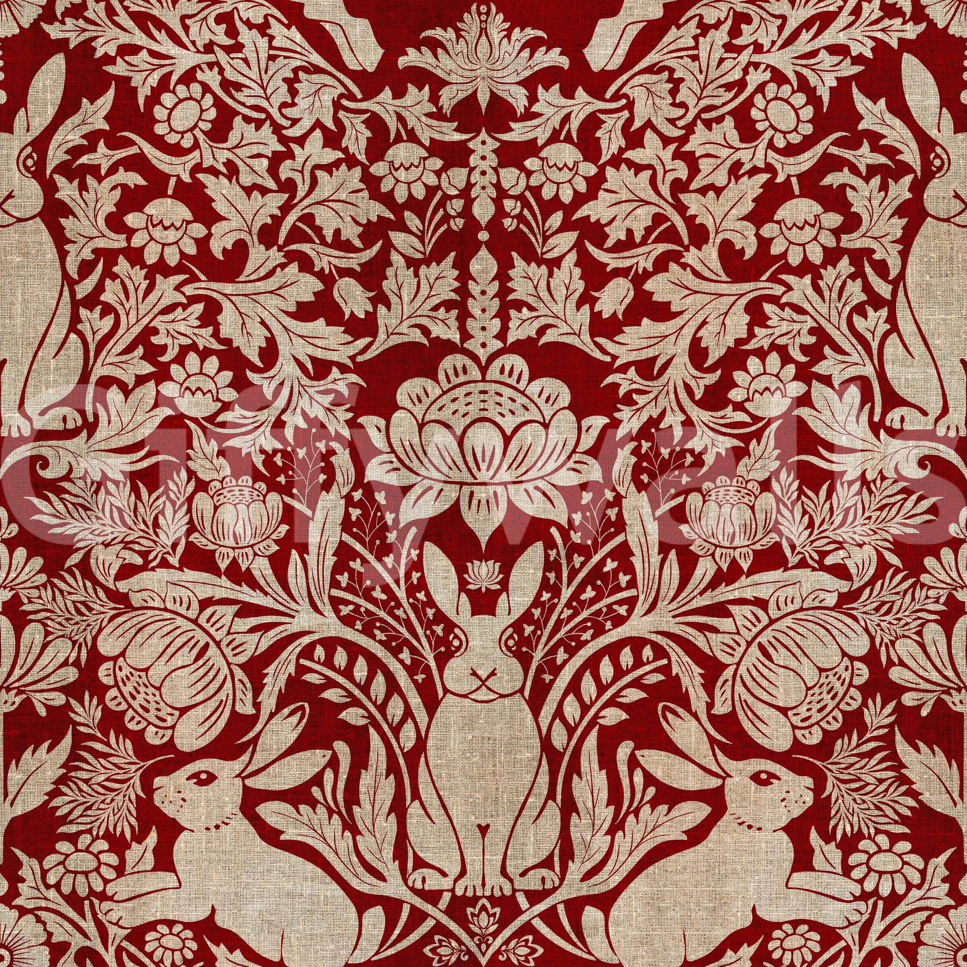 Elevate your home with this captivating wallpaper for walls that features a repeating pattern with stylised rabbits and elaborate floral arrangements in scarlet and beige. This design offers a blend of heritage and playful style. Picture this pattern enhancing bedrooms, living rooms, or dining rooms with a touch of timeless grace. Observe how its structure complements varied interiors, fostering a welcoming environment with character.