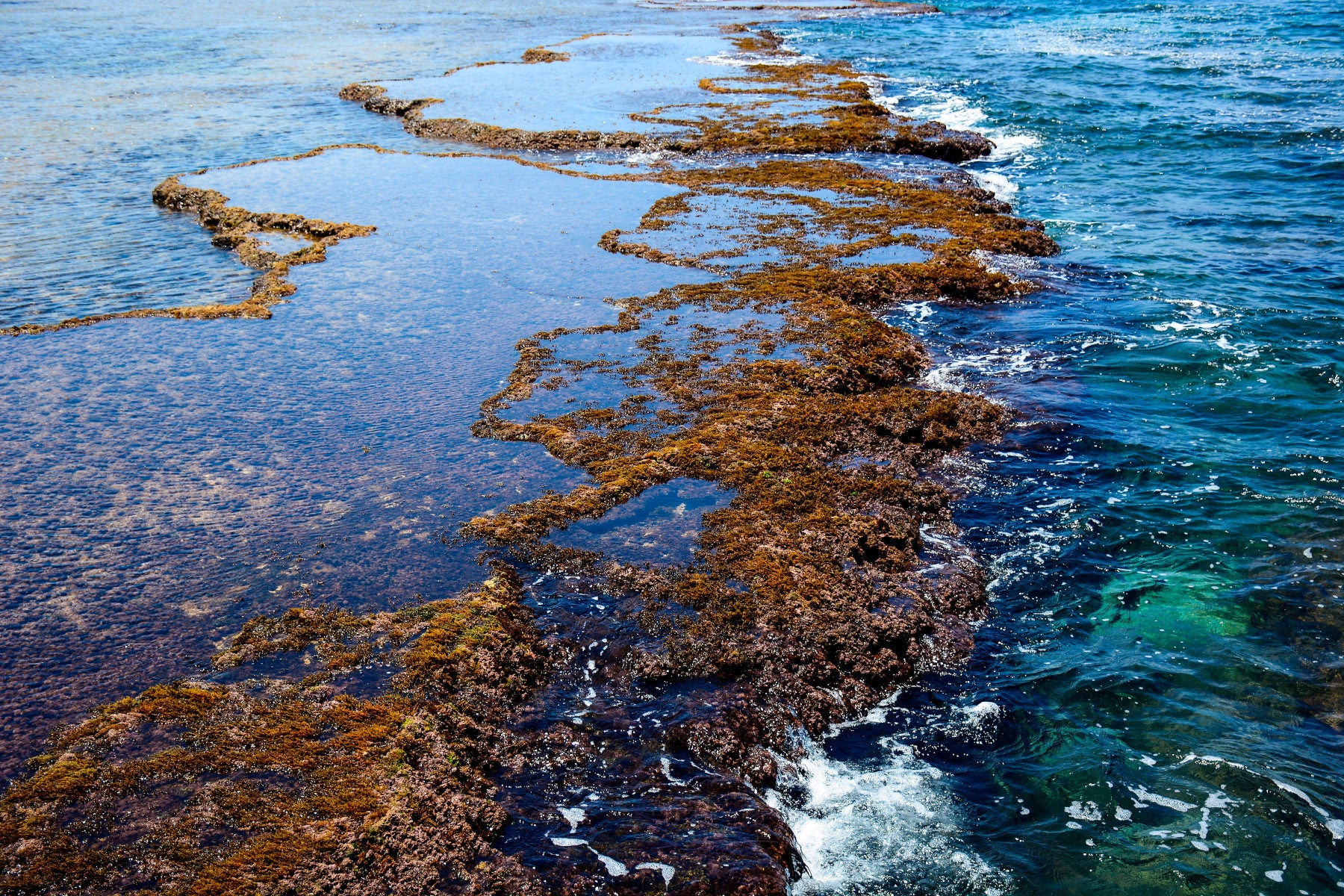 Immerse yourself in the captivating serenity of Sdot Yam beach #3 a stunning wallpaper showcasing the raw beauty of the Israeli coastline. This image captures a unique perspective of the shoreline, where a rugged, seaweed-draped rock shelf meets the turquoise embrace of the Mediterranean Sea. The crystal-clear water gently laps against the textured surface, creating a mesmerizing display of light and shadow. Discover the intricate details of the submerged landscape, with its diverse marine life, and the power of the ocean as waves subtly crash against the coastline. Bring the tranquility of Sdot Yam beach into your digital space, and let the soothing colors and natural patterns inspire a sense of calm and wonder. This wallpaper is a perfect escape to the captivating scenery of a remote Mediterranean paradise.