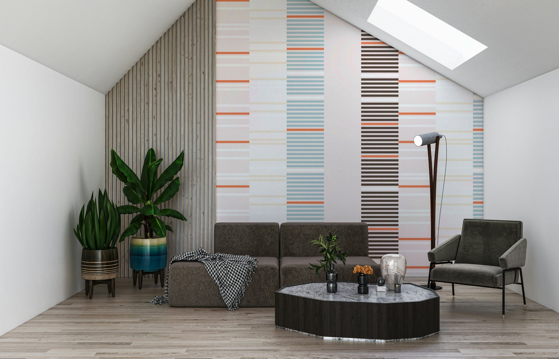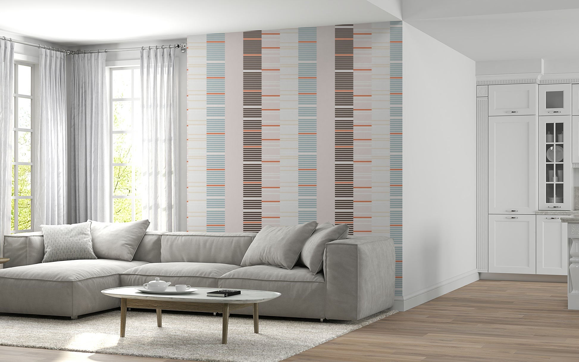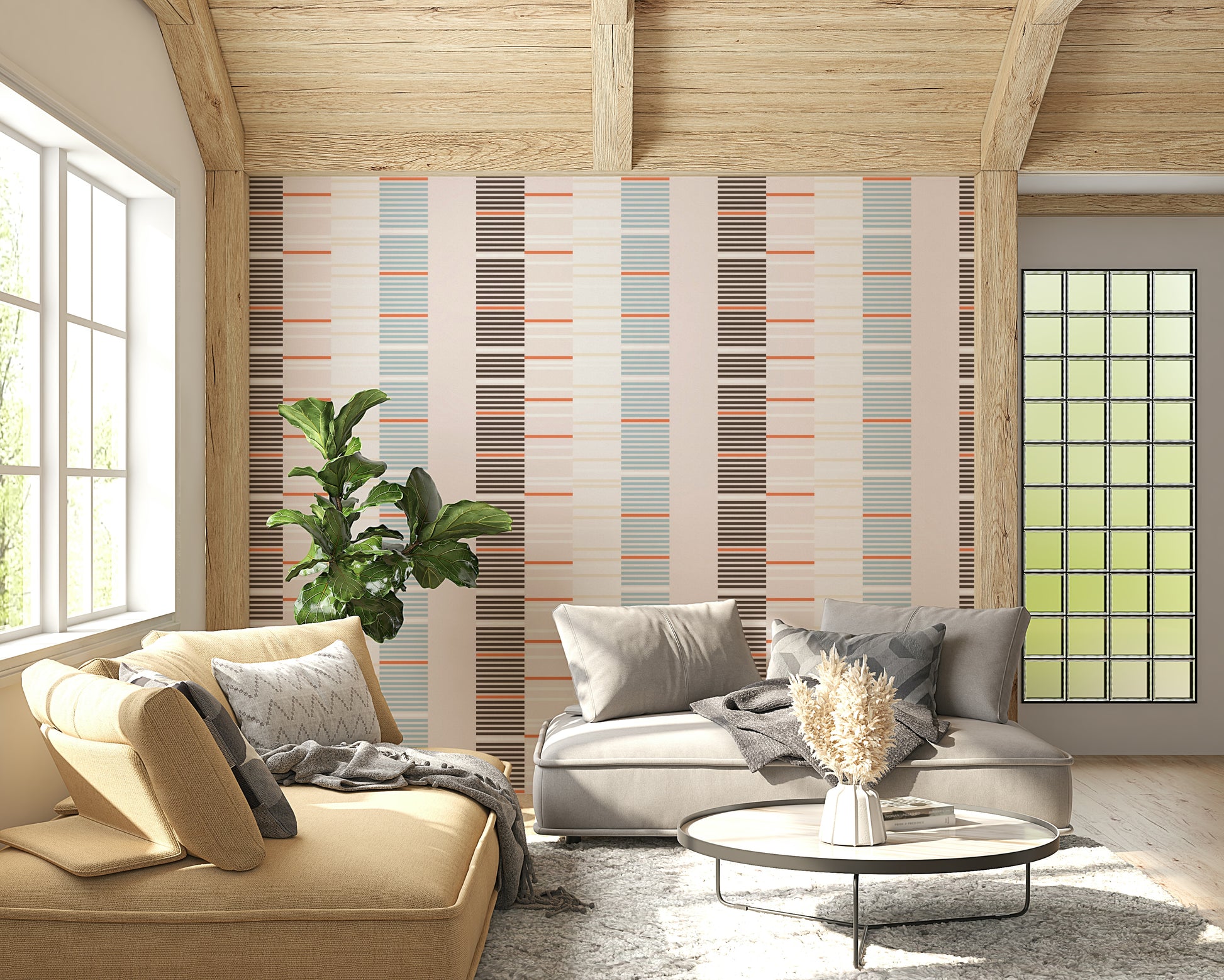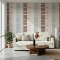 Sea Drift is a minimal, rhythmic design inspired by layers of tide marks and driftwood textures along the shoreline. Alternating slim bands in warm coral, sandy beige, and deep charcoal create a contemporary linear flow that feels both modern and organic. The balanced simplicity makes it ideal for wallpapers — bringing a subtle coastal sophistication to any wall.