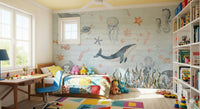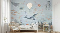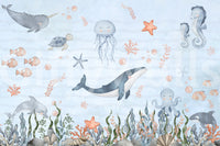 Invite the wonders of the sea into your home with this playful wallpaper for walls! This charming design presents an underwater scene featuring adorable marine animals. Gentle waves and soft, pastel shades of blue and peach create a tranquil mood. It's ideal for a nursery, playroom, or any space where you want to foster a sense of calm. The design beautifully complements interiors, adding a splash of childlike joy. This wallpaper is perfect for a unique feature wall!