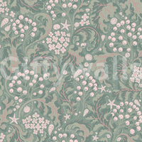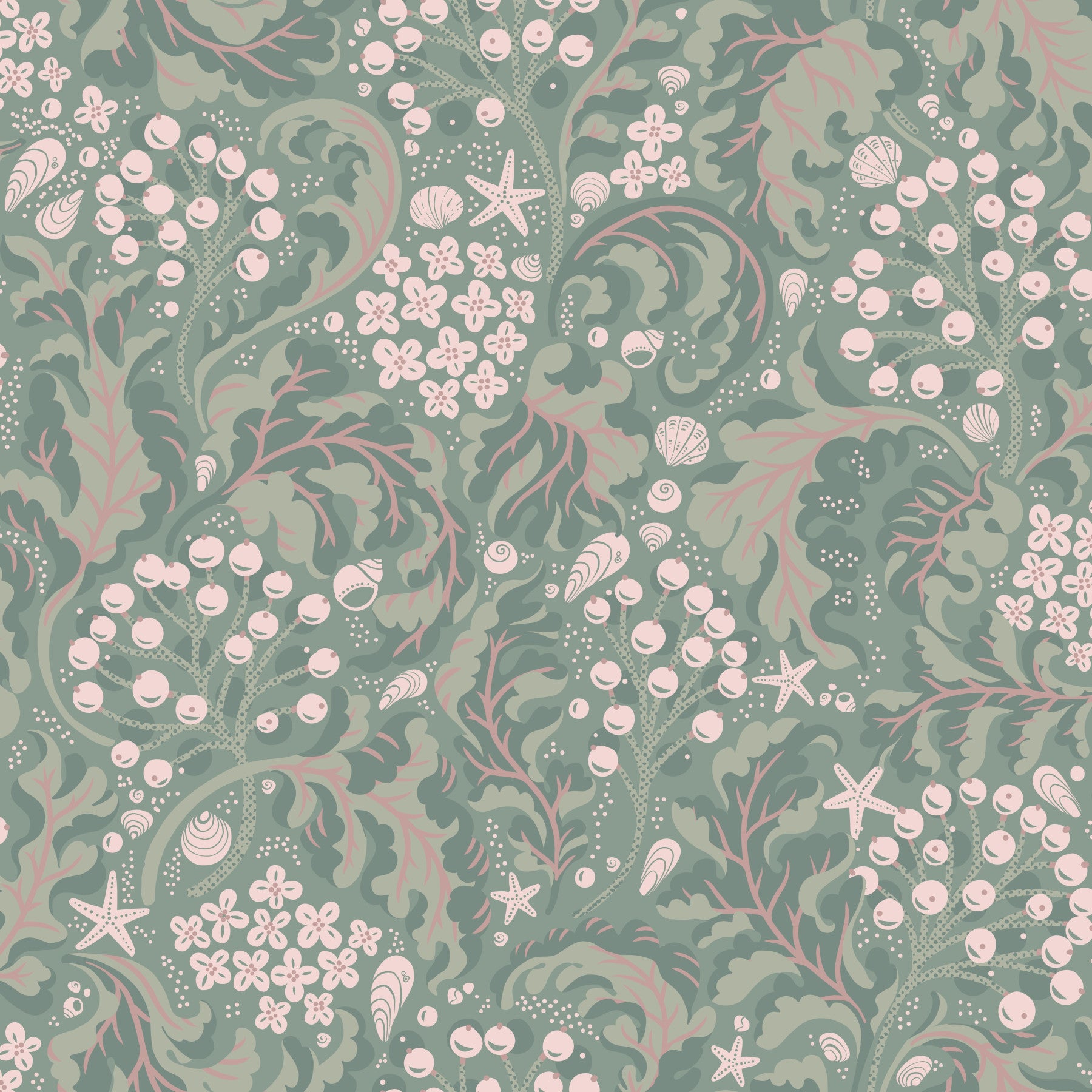 Dive into a serene underwater dreamscape with "Sea Kale - Rhubarb Green." This wallpaper showcases a captivating blend of stylized sea kale and delicate floral elements in soothing rhubarb green and blush pink hues. Intricate, flowing lines create a sense of peaceful movement, reminiscent of ocean currents. Scattered starfish and seashells add a touch of coastal charm, enhancing the tranquil atmosphere. The harmonious color palette and organic patterns create a calming and sophisticated backdrop for any digital device, bringing a touch of the seaside to your screen.