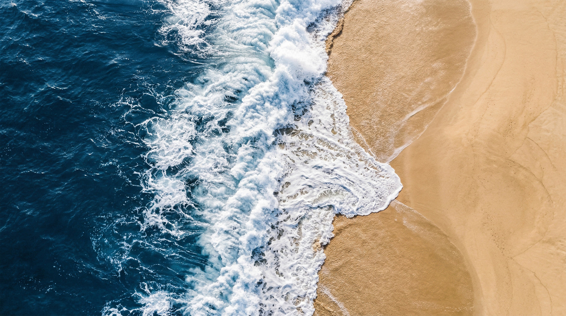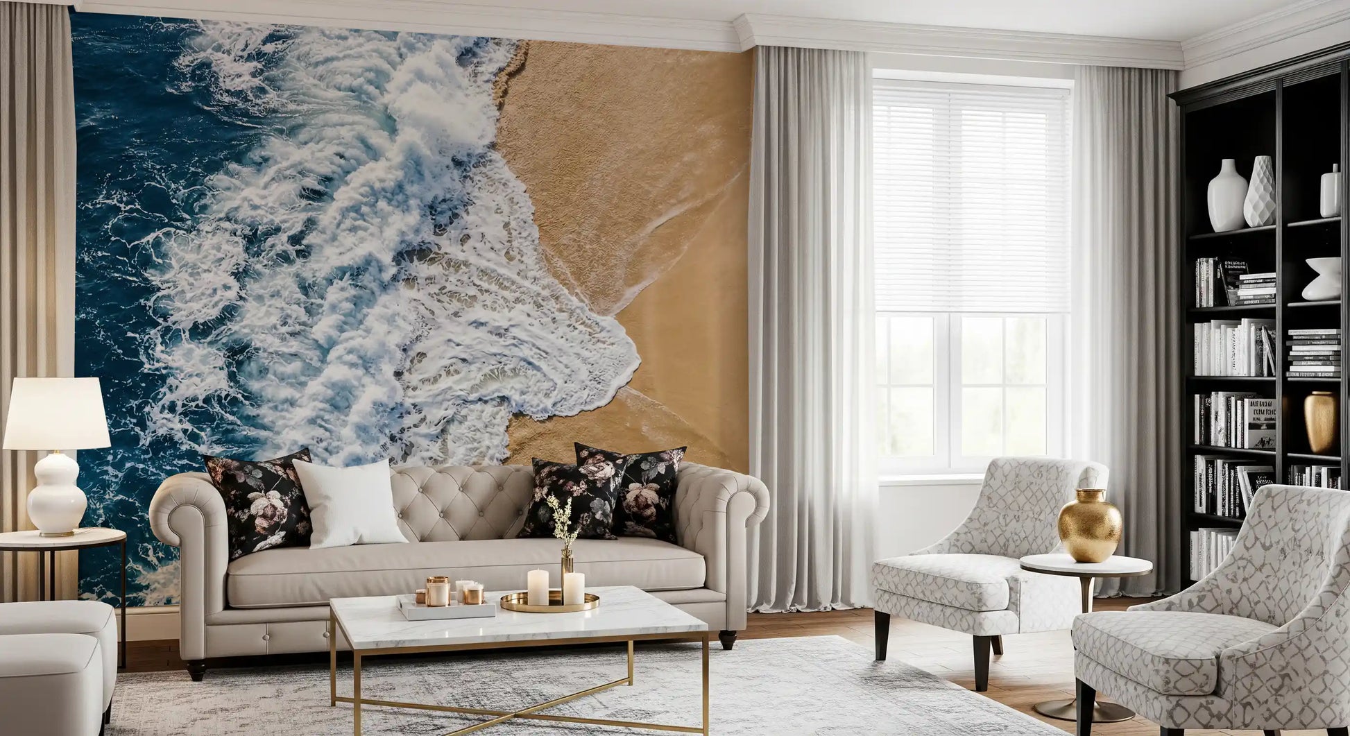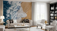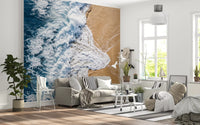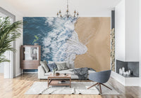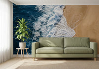 Immerse your space in the tranquil beauty of the ocean with this stunning wallpaper for walls. An aerial perspective captures a powerful wave as it dramatically meets the warm, golden sand. Deep blue hues of the vast sea transition seamlessly into the vibrant white of the frothing surf, creating a dynamic yet peaceful visual. The contrasting palette of serene blues and soft beige brings a refreshing coastal style to any interior. This design enhances living rooms, bedrooms, or bathrooms by creating an expansive, calming atmosphere. It perfectly complements minimalist or nautical décor, inviting a sense of natural tranquillity and spaciousness. Transform a feature wall, making a bold statement, or apply throughout for a consistent, serene retreat.