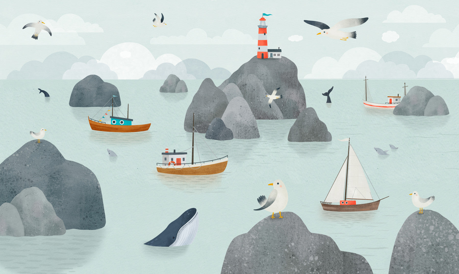 Seaside Stories Wall Mural features a playful coastal illustration with boats, seabirds, lighthouse elements, and gentle ocean scenery arranged in a balanced layout. The design combines soft colors with nautical details, making it suitable for wall mural use in modern interiors. Muted blue tones and natural textures create a calm visual effect, while illustrated elements like boats and marine life add light character without overwhelming the space. This supports a clean and organized appearance, allowing the mural to work well as a focal surface. Its wide composition and soft detailing make it suitable for kids rooms, nurseries, bedrooms, and creative spaces. The mural offers a cohesive seaside theme, providing a practical option for interiors that require a light, nature-inspired design with subtle storytelling elements.