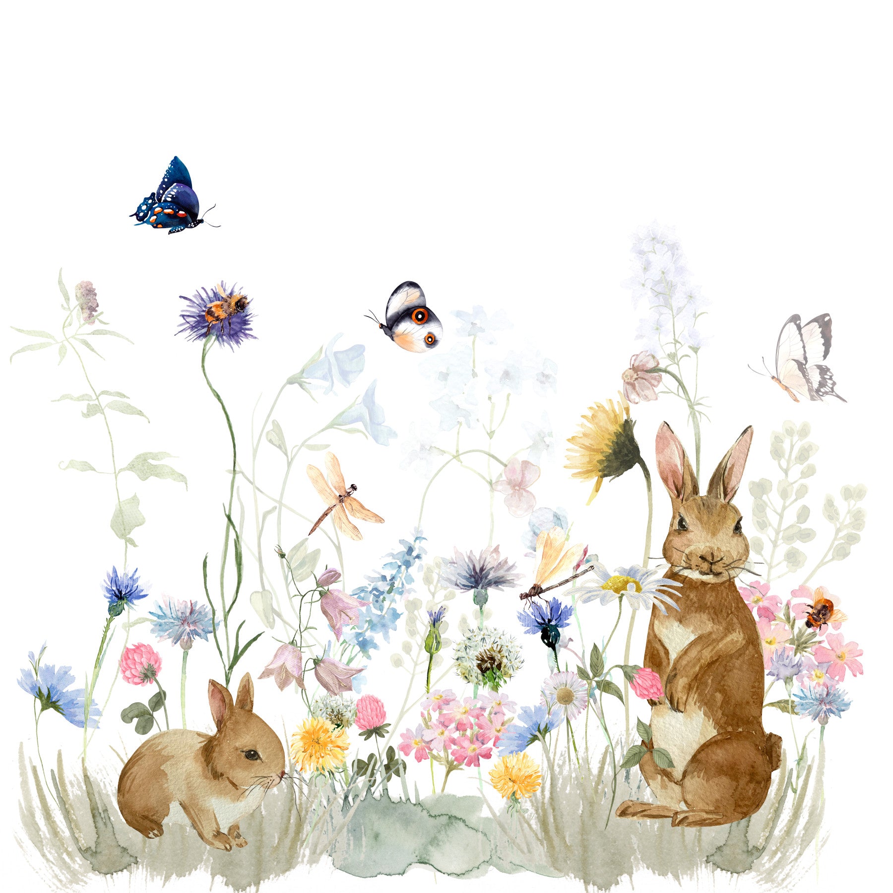 Escape to a secret garden with this captivating watercolor wallpaper. Two sweet bunnies share center stage amidst a profusion of delicate wildflowers, gracefully interacting with butterflies and dragonflies. The soft, muted color palette of pinks, blues, and yellows creates a tranquil and inviting ambiance, perfect for adding a touch of gentle whimsy to a nursery, bedroom, or living space. The detailed floral elements and charming bunnies invite a sense of peace and serenity.