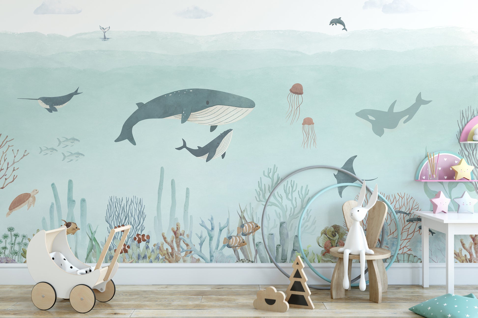 Magical sea adventure mural in blue for kids