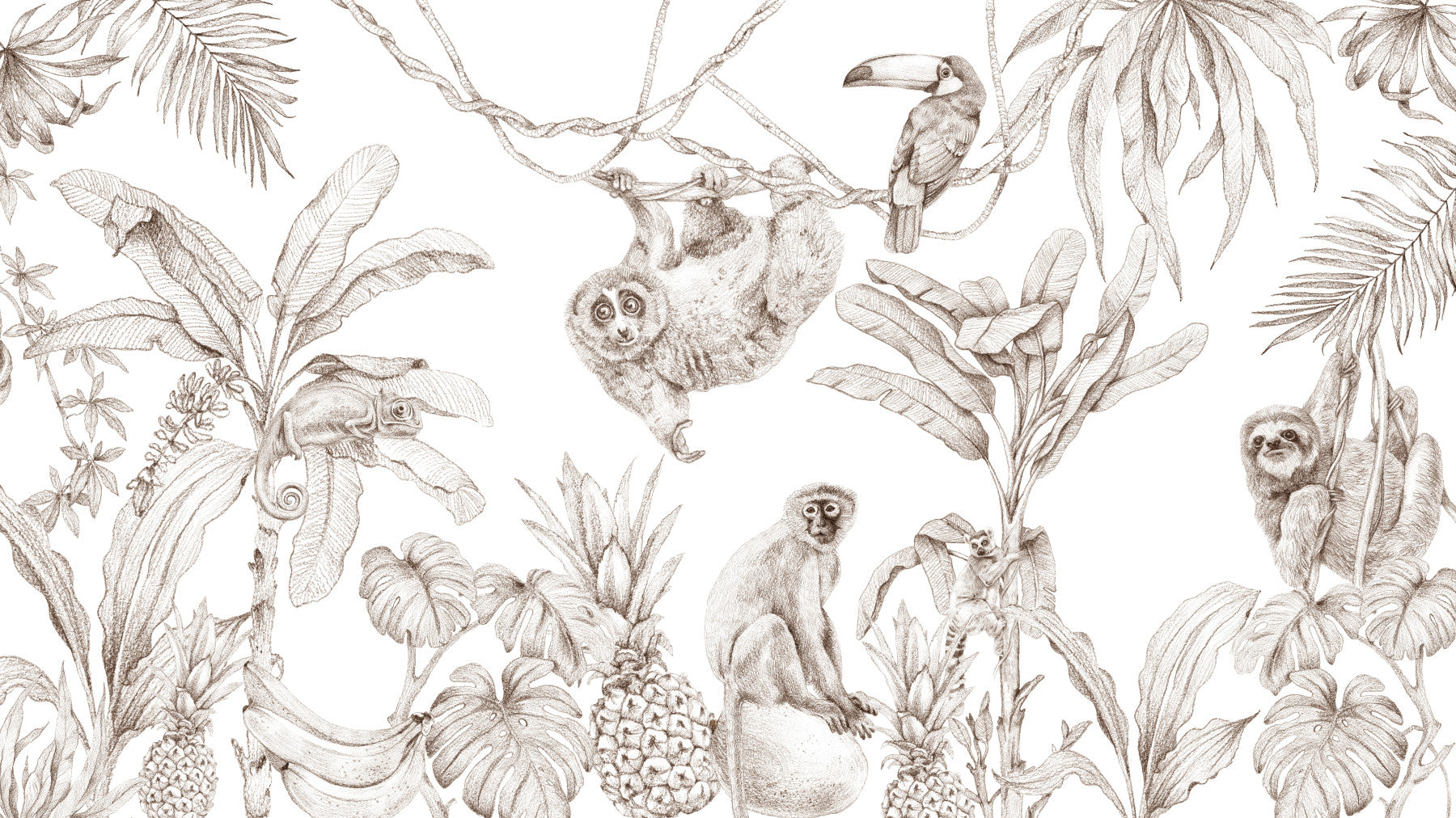 Indulge in the serene beauty of 'Sepia Jungle Reverie,' a wallpaper design that transports you to a lush, tropical paradise. Delicate sepia-toned illustrations depict a captivating array of exotic animals, including playful monkeys, charming sloths, and a majestic toucan, nestled amidst vibrant banana leaves, pineapples, and other tropical foliage. The intricate details and meticulous pencil strokes create a sense of calm and tranquility, making it an ideal choice for bedrooms, living rooms, or any space needing a touch of sophisticated nature-inspired elegance. The seamless pattern ensures a cohesive and immersive experience, while the sepia palette lends a vintage, timeless charm to your walls.