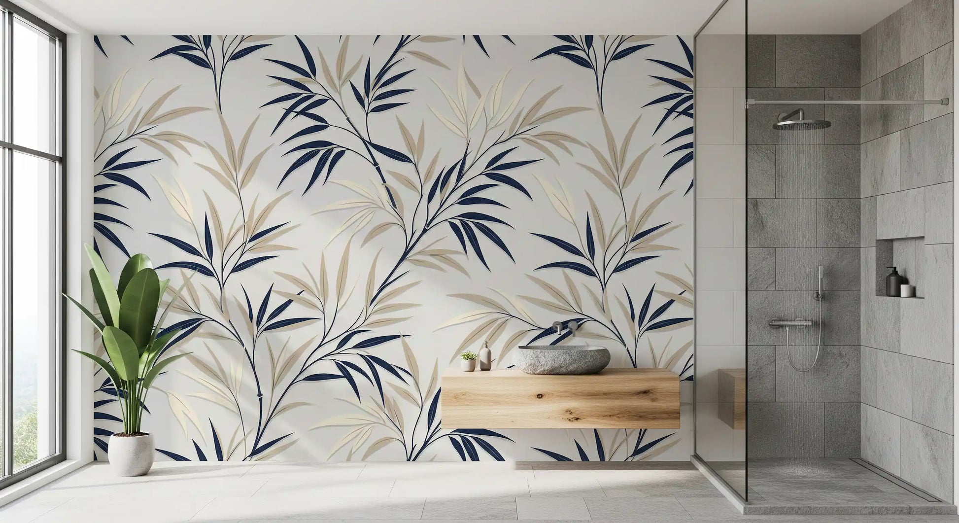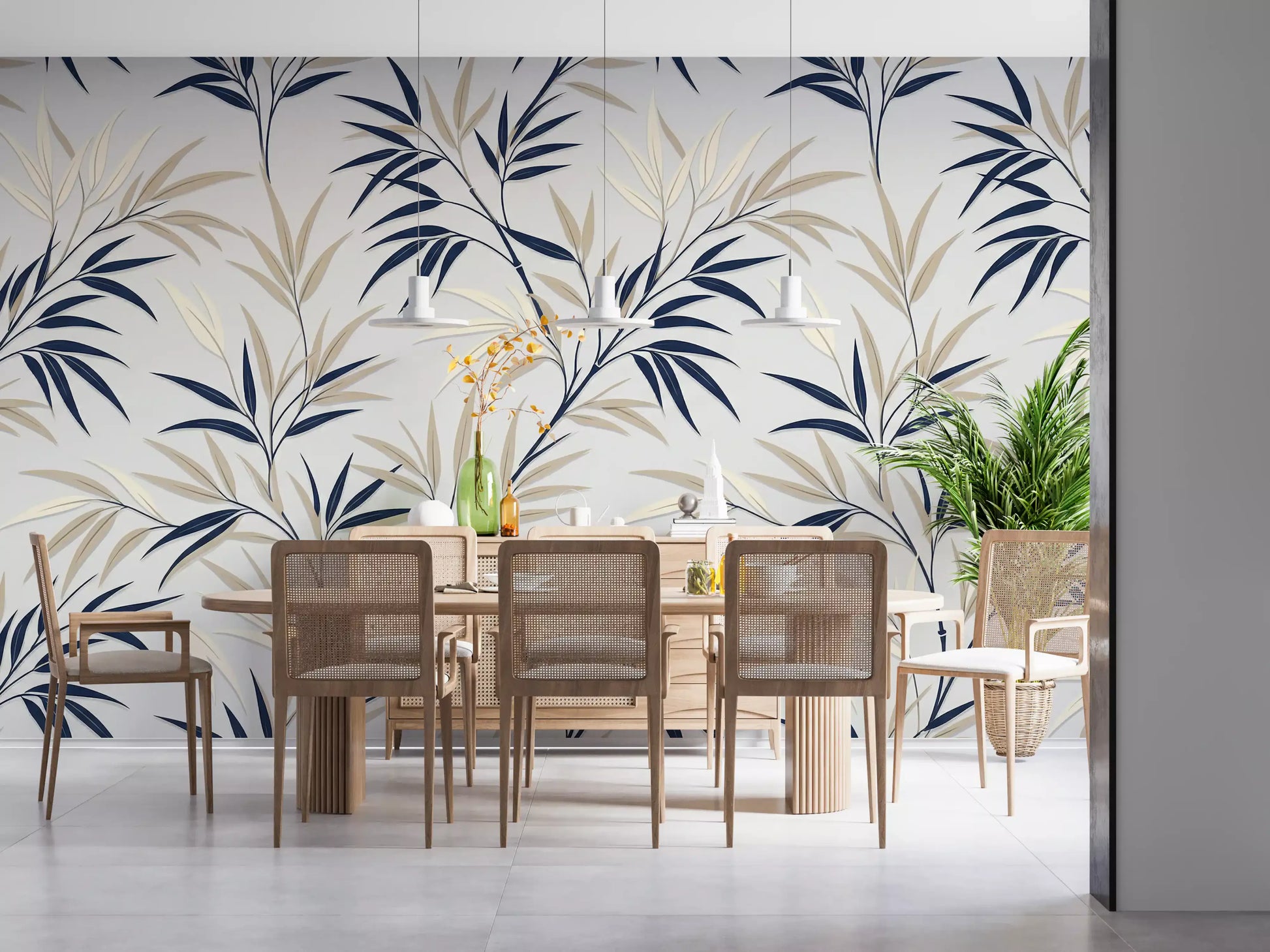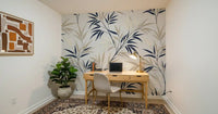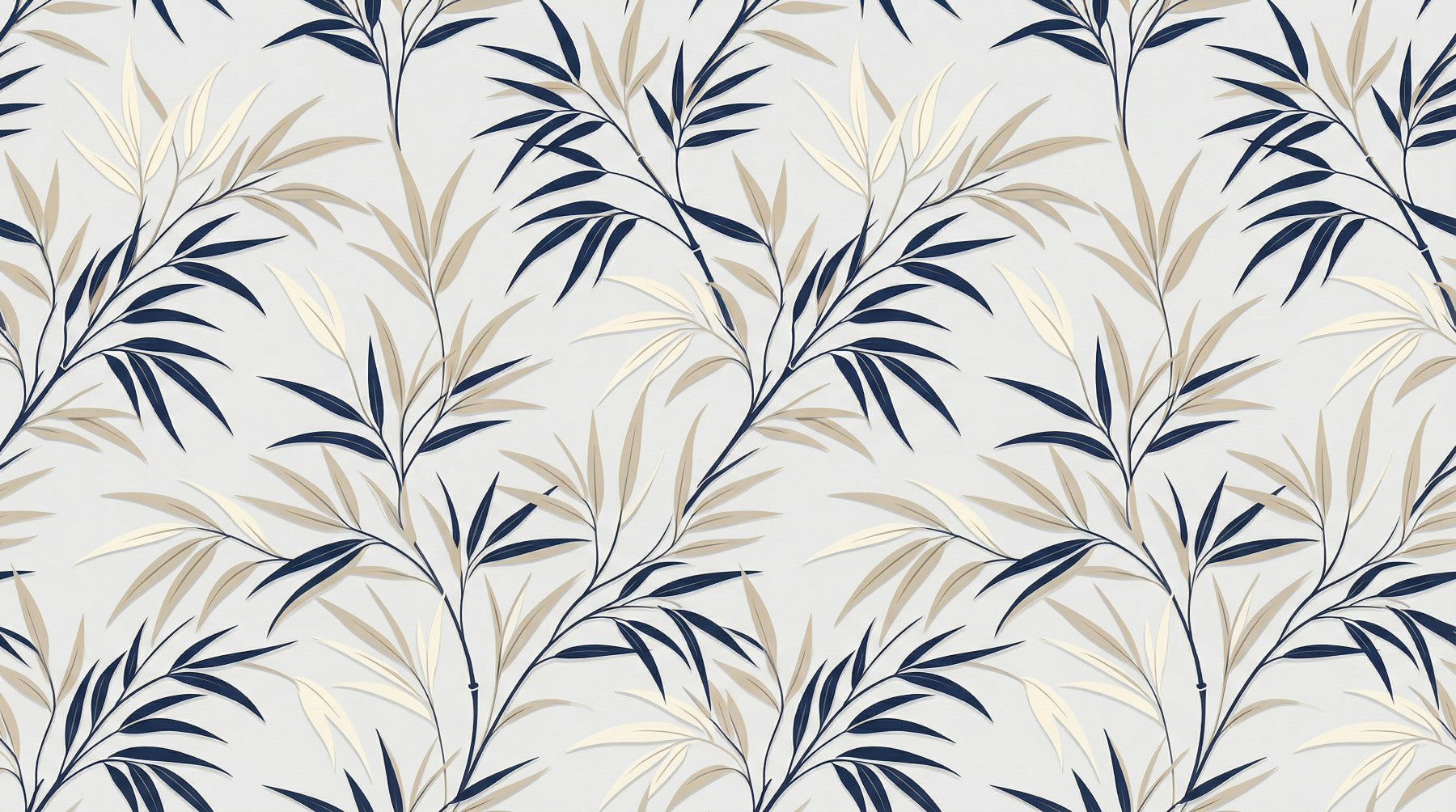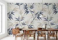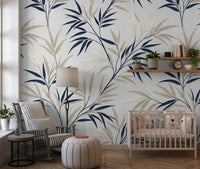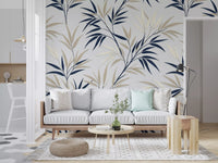 This exquisite wallpaper for walls effortlessly transforms any room with its serene botanical elegance. Delicate, stylised branches intertwine across the surface, showcasing a sophisticated palette of deep navy and soft cream leaves. A subtle light grey backdrop enhances the clean lines and graphic simplicity, creating a modern, refreshing aesthetic. This inviting design adds a tranquil, natural touch to living rooms, bedrooms, dining areas, or hallways, cultivating a calm and open ambience. The subtle layering effect gives each leaf a gentle, three-dimensional quality, lending quiet sophistication to your décor. This pattern complements contemporary and transitional styles, creating a peaceful sanctuary in your home.