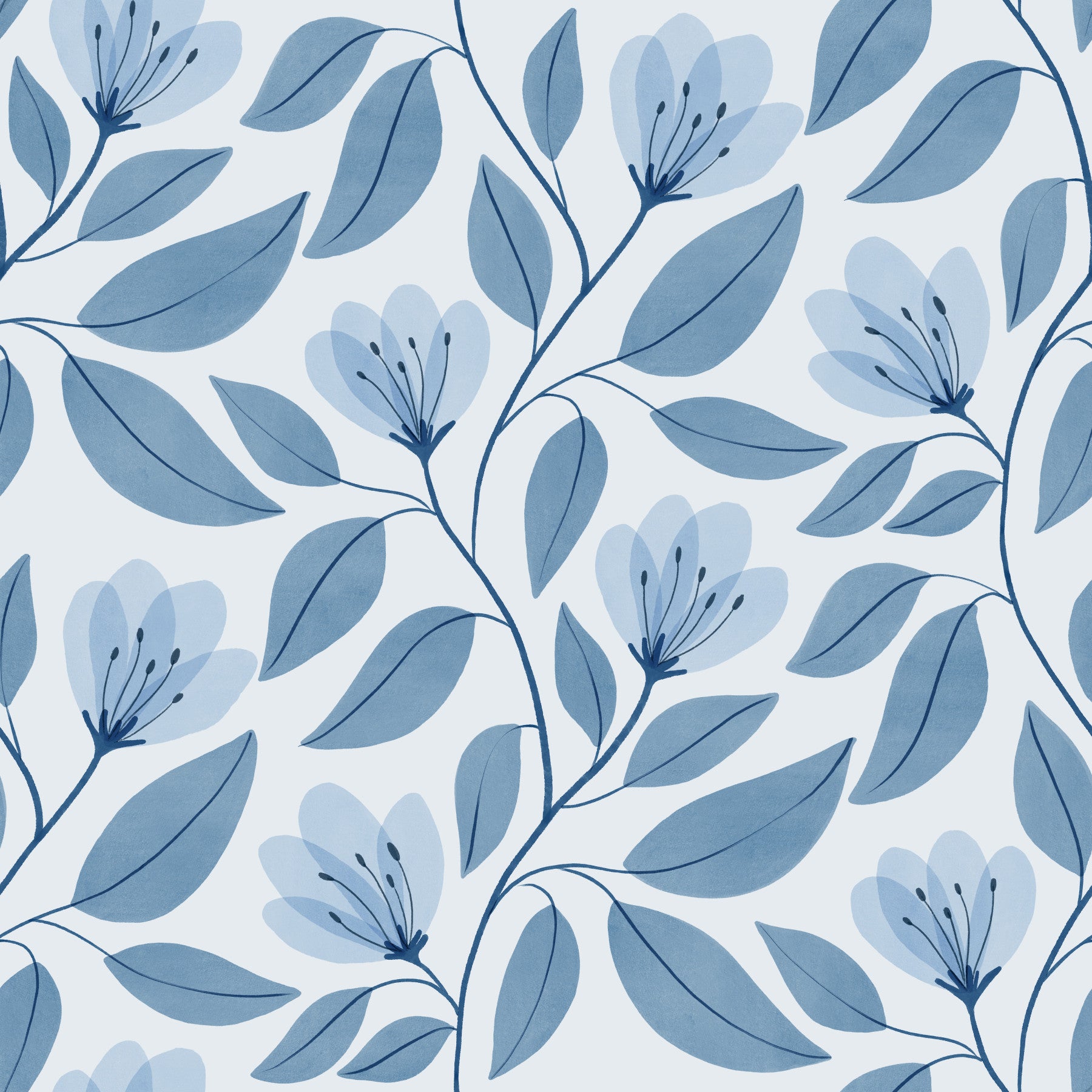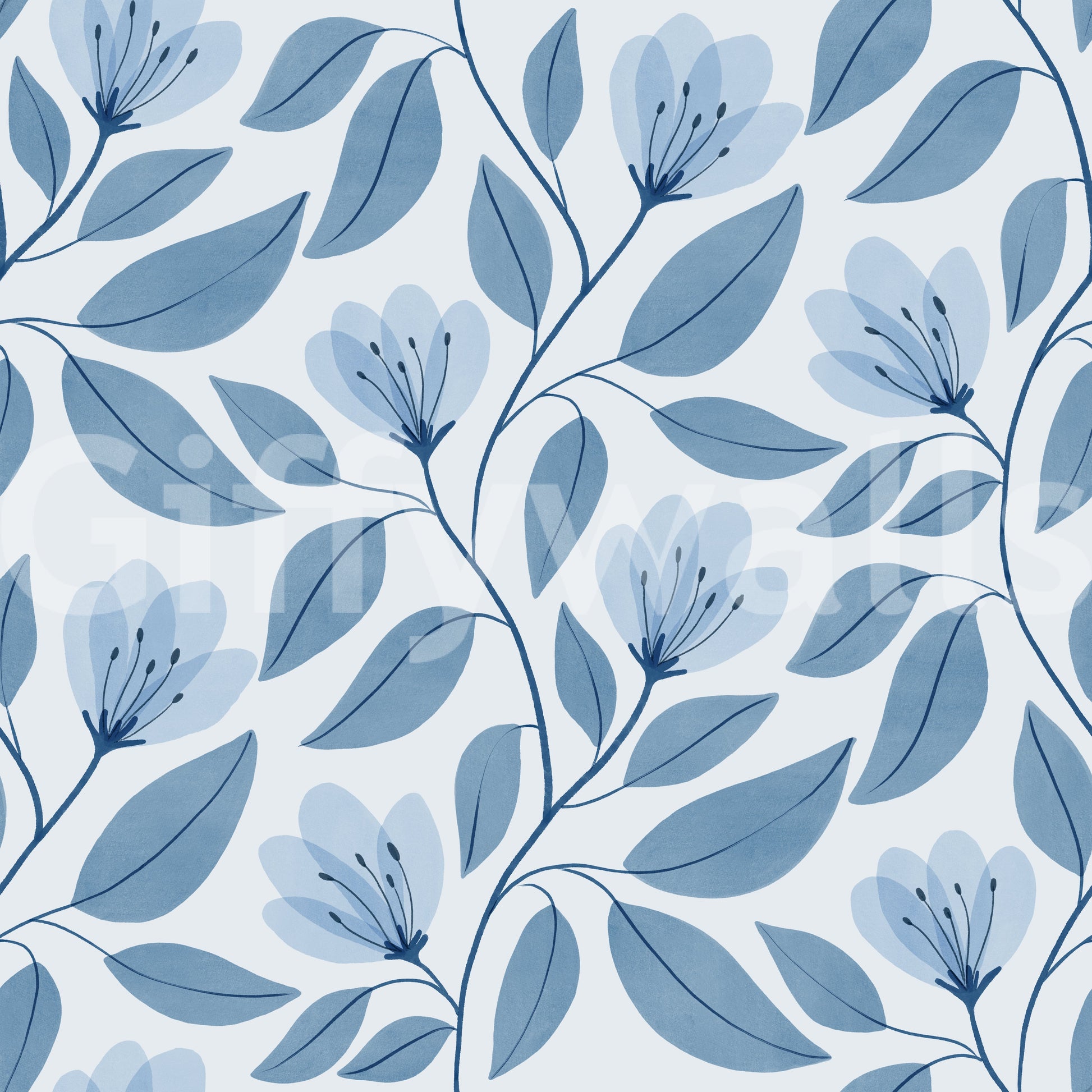 Transform your walls with the serene beauty of this blue floral wallpaper. The design showcases flowing branches with soft, translucent flowers and leaves in varying shades of blue. It creates a peaceful mood suitable for bedrooms, hallways, or reading nooks. The subtle texture adds depth, making it a sophisticated choice. Consider this charming floral wallpaper for walls to bring a restful vibe to your home. Enhance your interiors with nature's gentle touch.