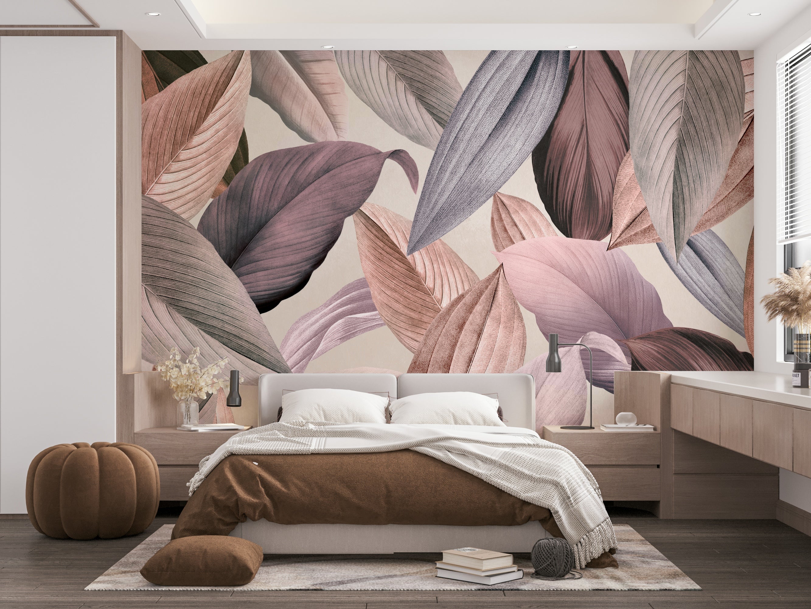 This wallpaper presents a captivating array of stylized leaves in a palette of muted pinks, purples, and browns. The leaves, rendered with exquisite detail, appear to float against a subtle off-white background, creating a calming and sophisticated atmosphere. The design is both elegant and organic, lending itself to a variety of interior styles, from minimalist modern to classic bohemian. The soft hues and delicate textures evoke a sense of tranquility and peace, making this wallpaper an ideal choice for creating a serene and relaxing space in any room of your home. The seamless pattern ensures a harmonious and visually pleasing effect across any wall.