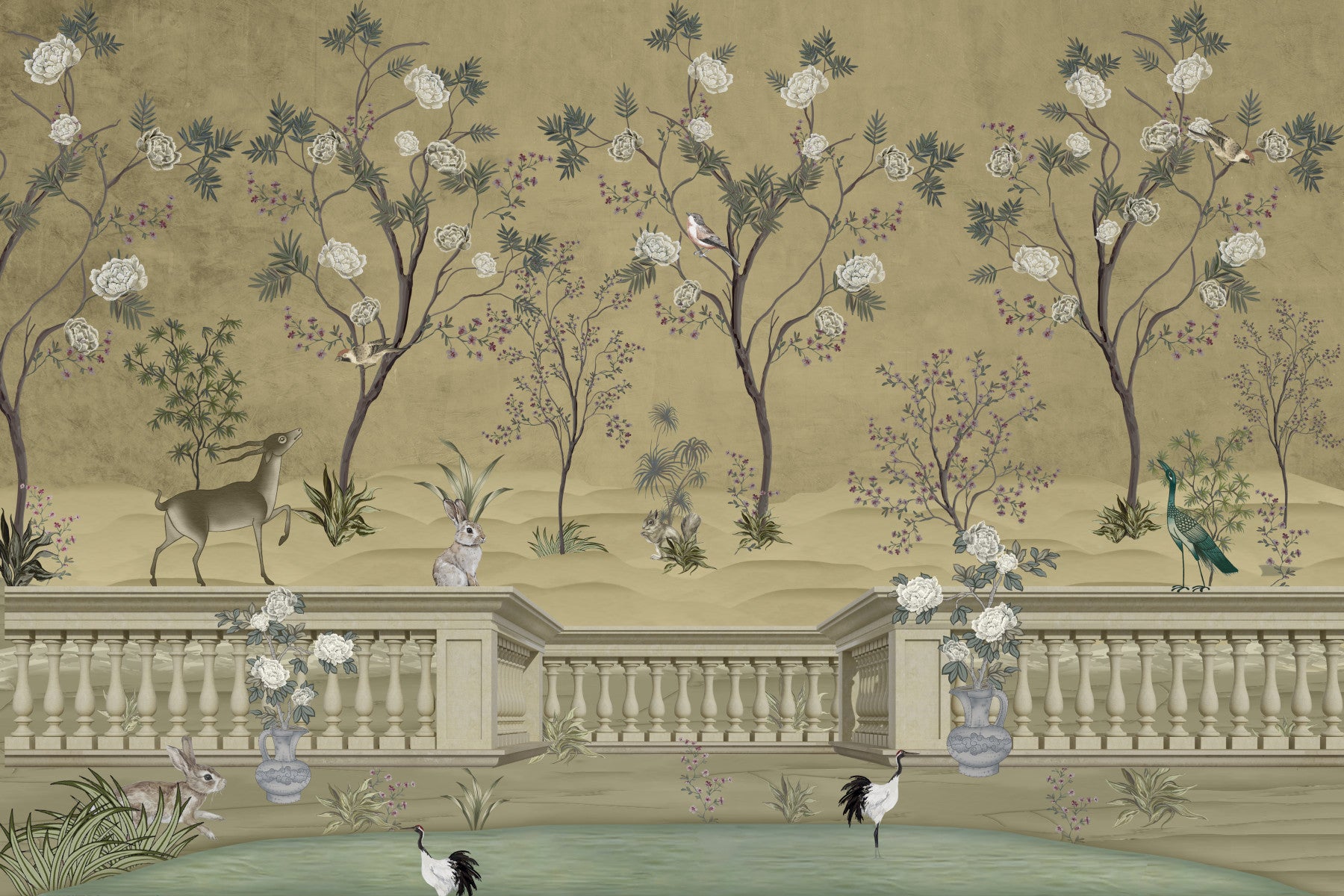 Bring a touch of elegance to your home with this stunning chinoiserie-style wallpaper for walls. Soft, muted tones of olive green and beige create a peaceful backdrop. Delicate white flowers and graceful birds enhance the calm atmosphere. Animals subtly decorate this pattern which is a visual delight. Ideal for a bedroom, living room, or dining area, this wallpaper adds a sophisticated, artistic flair that complements classic and modern interiors.