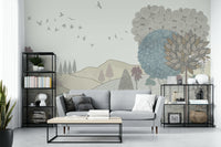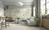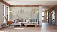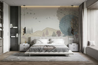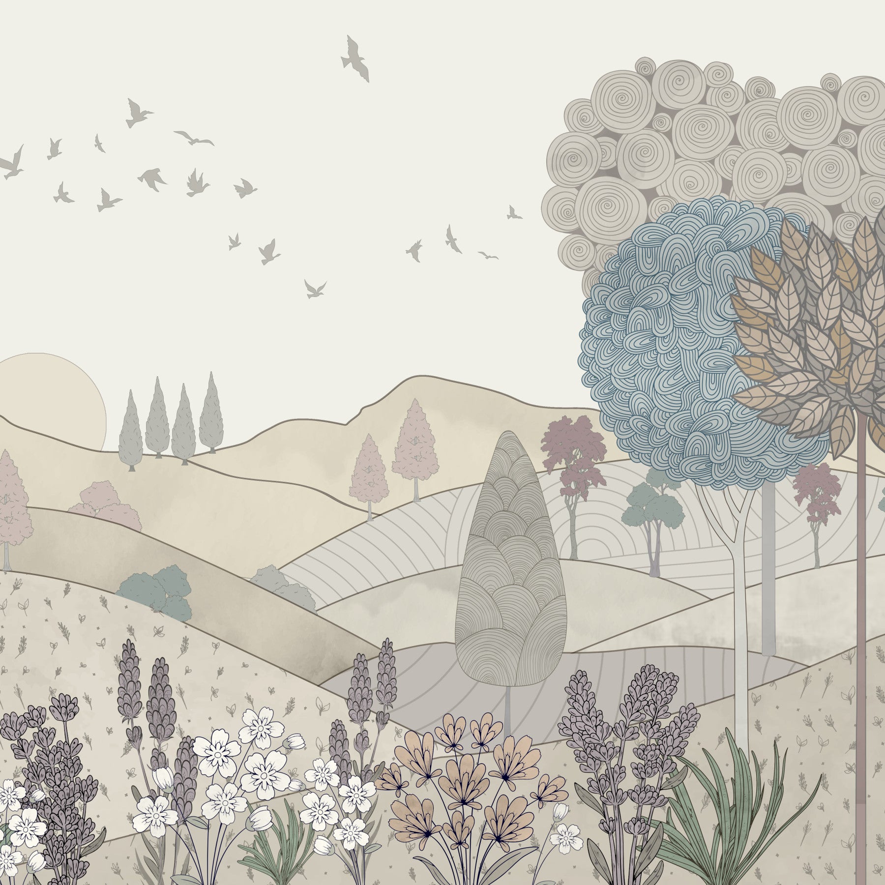This wallpaper transports you to a picturesque countryside, rendered in a soft, dreamy style. Delicate linework defines rolling hills, whimsical trees with swirling patterns, and a profusion of lavender and other wildflowers. The overall color palette is muted and peaceful, combining shades of beige, grey, and pale lavender. The inclusion of a small house adds a cozy touch, enhancing the feeling of tranquility and escape. Perfect for creating a serene and calming atmosphere in any room.