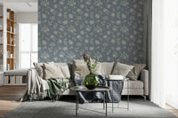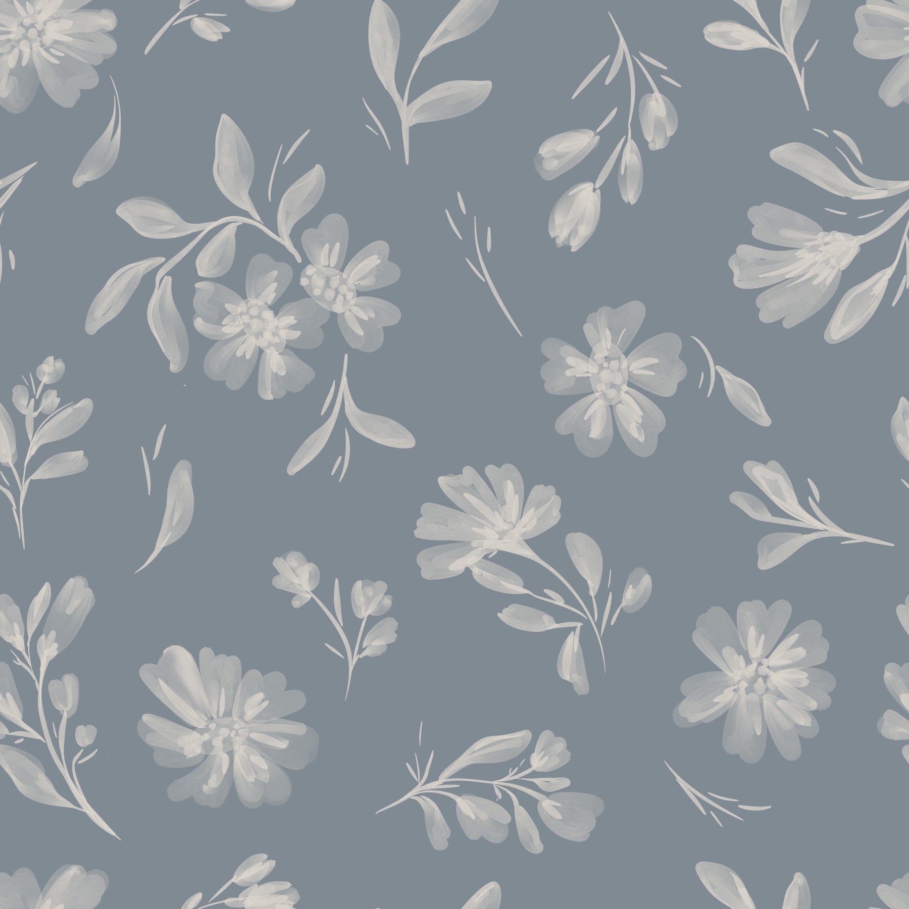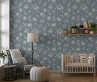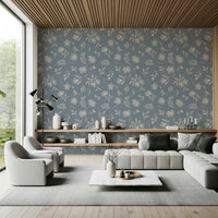 Add a touch of nature to your home with this serene floral wallpaper. It showcases simple white flowers and leaves on a muted blue backdrop, providing a peaceful and calming atmosphere. The brushstroke details add artistic flair to the design. This beautiful wallpaper for walls enhances bedrooms, living rooms, or home offices. Its soft colour scheme and delicate floral pattern complement a variety of interior styles, infusing a touch of serene elegance into any space.