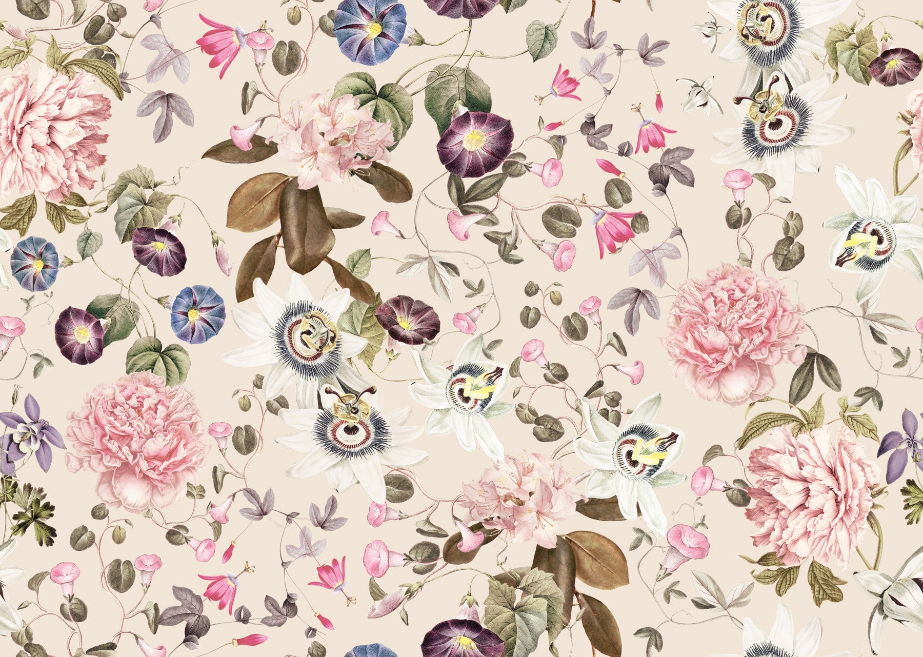 Escape to a tranquil garden with 'Serene Garden Escape,' a wallpaper design that captures the essence of peaceful nature. This wallpaper features a lush collection of delicately rendered flowers, including peonies, passionflowers, and morning glories, painted in soft watercolor hues. The calming pastel palette of pink, purple, and green blends harmoniously with a warm beige background, creating a serene and inviting atmosphere. Perfect for bedrooms, living rooms, or any space where you seek a calming retreat, this wallpaper brings the tranquility of a blooming garden directly into your home. Its seamless pattern and timeless design ensure effortless elegance and sophistication.