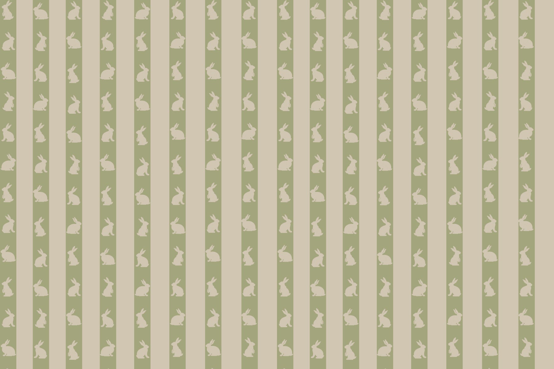 Introduce a peaceful vibe to your living space with this understated rabbit pattern. Vertical stripes in soft greens and muted beige display simple rabbit figures. This design provides an adaptable canvas that enhances interiors. It's excellent wallpaper for walls in bedrooms, bathrooms, or hallways. Its delicate charm adds character without overwhelming the space. Enjoy a touch of nature-inspired serenity.