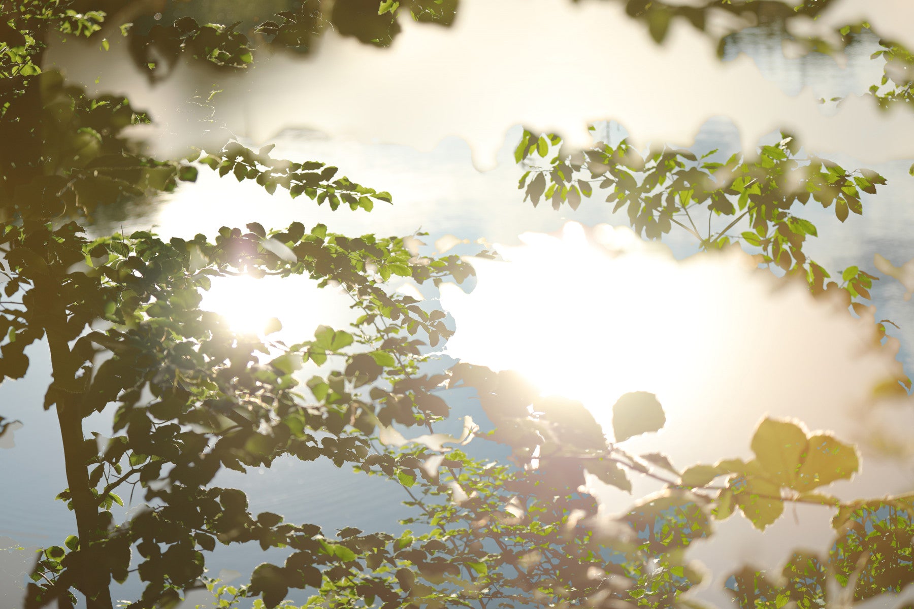 This stunning photograph presents a tranquil moment where sunlight dances on the water's surface, framed by lush green leaves. The interplay of light and reflection creates a soothing atmosphere, perfect for enhancing any space.
