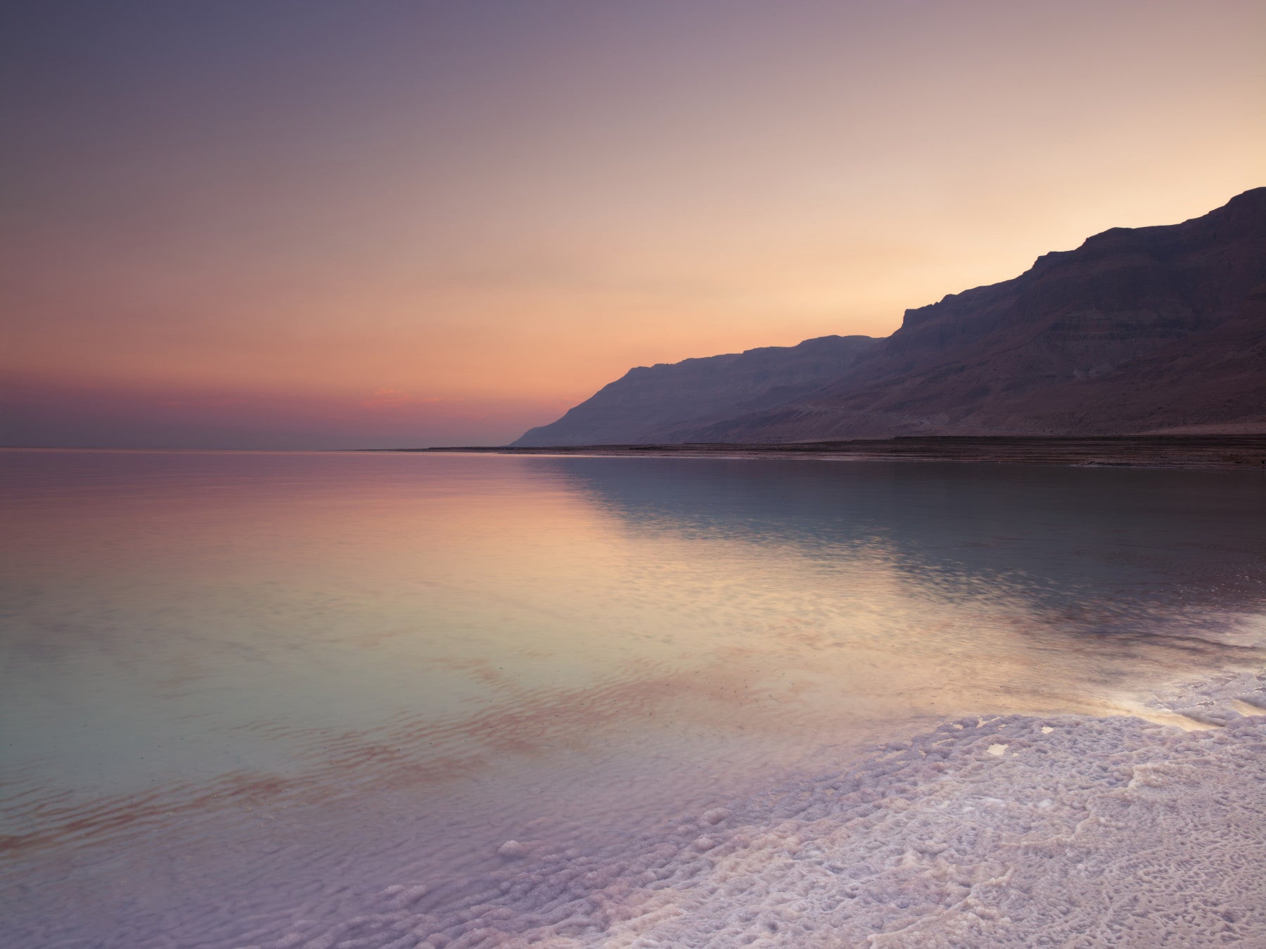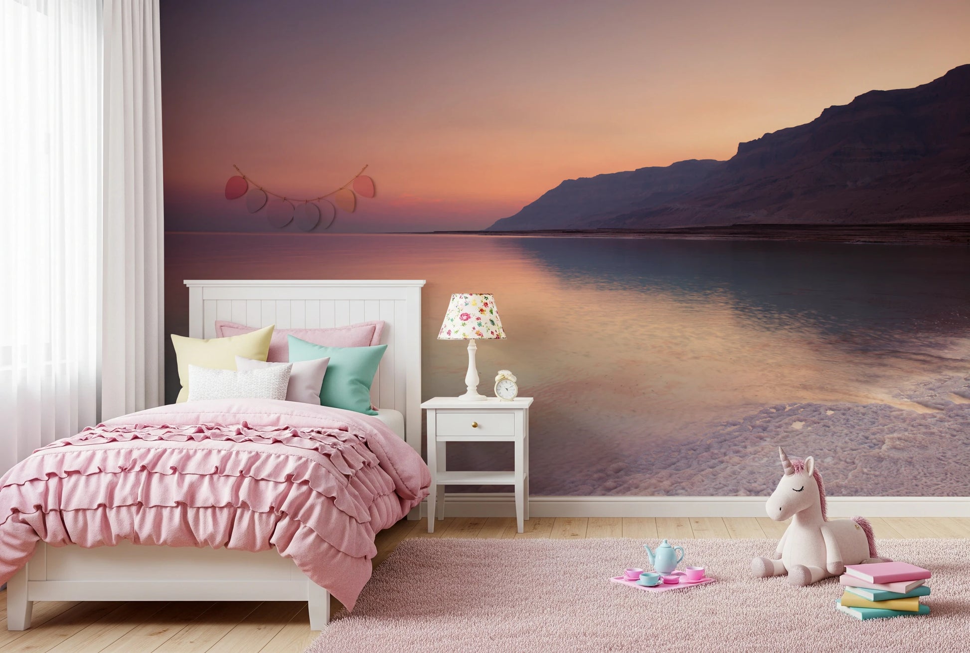 Immerse yourself in the tranquil beauty of the "Serene Sunset Shoreline". This stunning piece captures the magical moment when the sun dips below the horizon, casting a warm, pastel glow across the still waters and rugged coastline. The sky transforms into a canvas of soft pinks, oranges, and purples, mirrored flawlessly on the water's surface. A distant, shadowy mountain range adds depth and mystery to the scene. The unique shoreline, textured with intriguing salt formations, creates a captivating foreground. This serene image offers a calming presence, bringing the peace and beauty of nature into your living space. Transform any room into a sanctuary with this breathtaking vista.