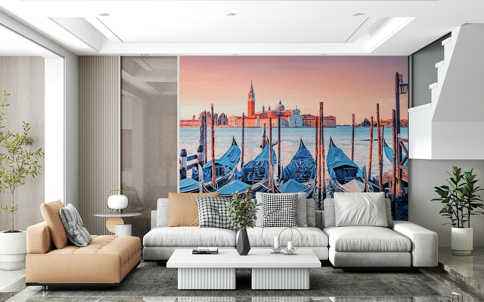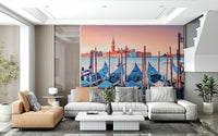 Embrace the beauty of Venice with this evocative wallpaper for walls. This design features the classic gondolas and architecture against a backdrop of a soft sunset, adding a touch of Italian romance to any interior space. The muted hues and gentle water create a serene atmosphere, perfect for bedrooms or living rooms. Infuse a sense of travel into a home office or bring a touch of classic elegance to an entryway. This wallpaper enhances the beauty of interiors with its sophisticated charm and tranquil colour scheme.