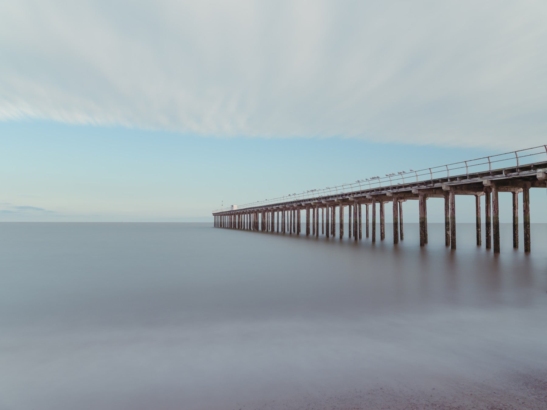 Felixstowe Pier stretching into the sea. Invite tranquility into your space with this calming seascape. The long exposure captures the subtle motion of the water and sky, creating a peaceful ambience. The neutral tones enhance various interior styles. The subtle colors pair effectively with rooms wanting a touch of calm and peace. Consider this wallpaper for walls in living rooms, bedrooms, or home offices to foster a relaxed setting. Its sleek design complements modern interiors, creating a fresh backdrop.