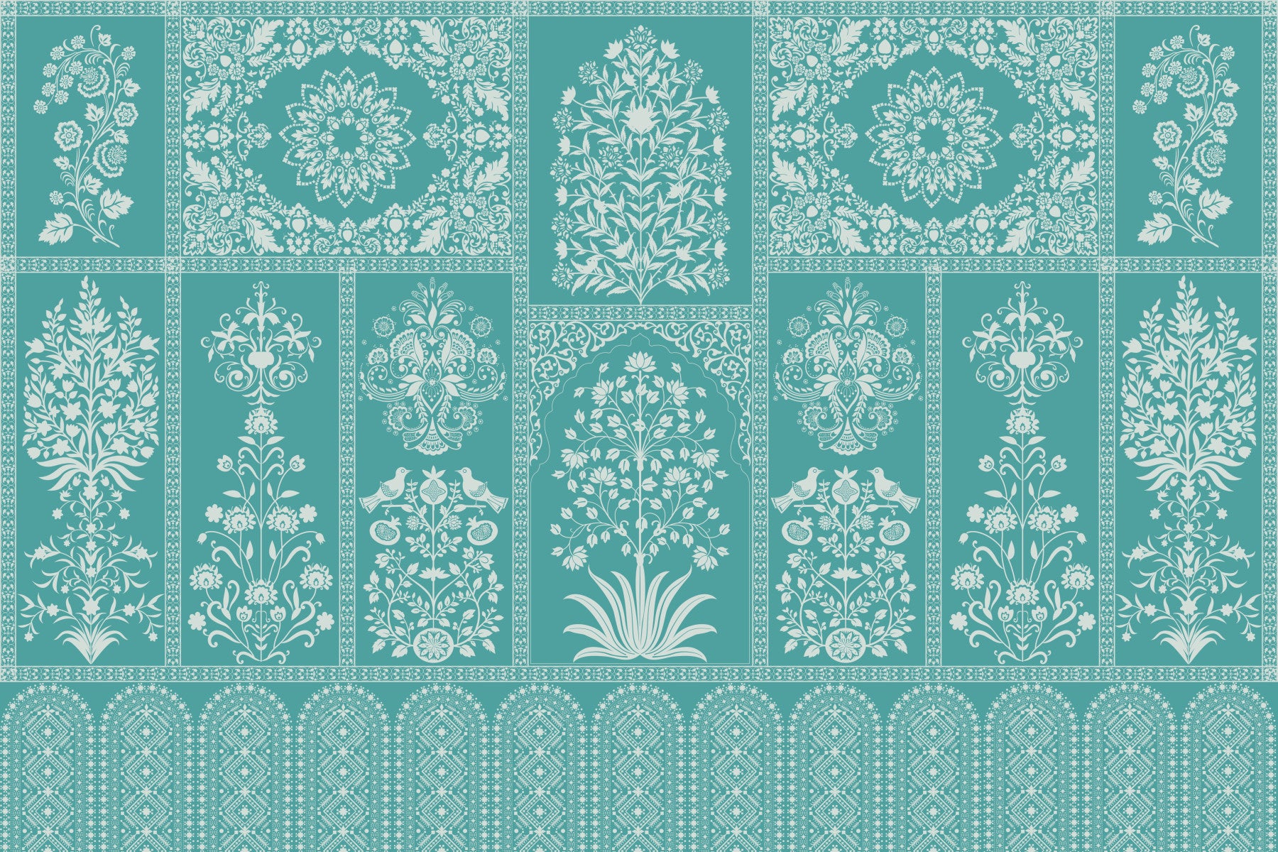 Escape into the tranquility of Sheetal Upvan a soothing wallpaper inspired by the serene beauty of Indian gardens. This exquisite design features intricate floral and botanical motifs in a calming palette of teal and soft white, evoking a sense of peacefulness and refreshing coolness. Geometric patterns blend seamlessly with stylized trees, blooming flowers, and delicate birds, all meticulously arranged within decorative panels. The overall effect is a harmonious blend of nature and art, reminiscent of traditional Mughal artistry. "Sheetal Upvan" will transform any space into a tranquil retreat, bringing a touch of elegance and serenity to your everyday life. Ideal for those seeking a calming and sophisticated atmosphere.