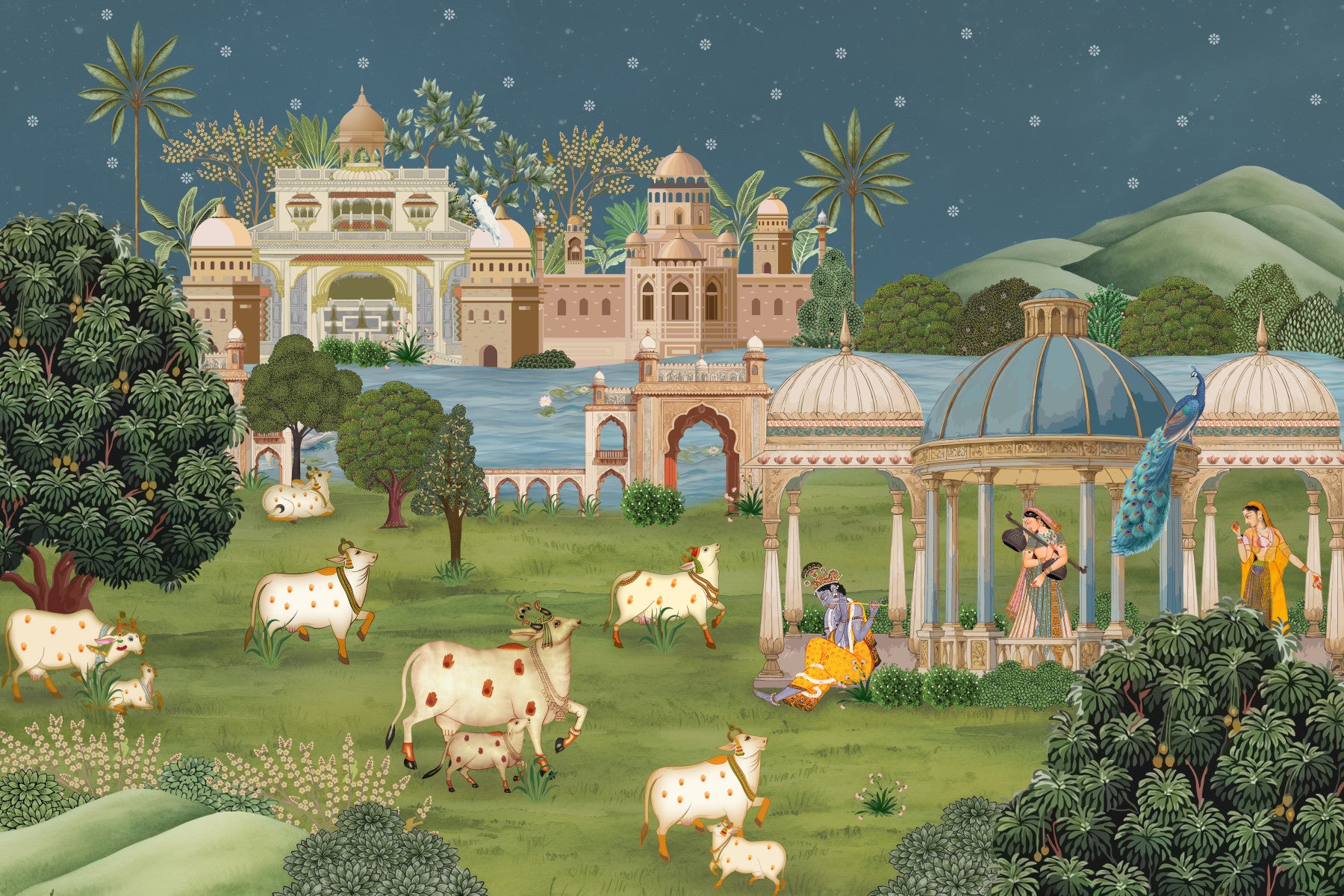 Escape into the serene beauty of "Shyam Kunj," a tranquil wallpaper that evokes a sense of peaceful divinity. This idyllic scene features meticulously detailed Mughal architecture nestled amidst lush greenery and a starlit sky. The gentle waters reflect the ornate structures, while cows adorned with handprints graze peacefully on the verdant lawns. Lord Krishna, resplendent in yellow, graces a pavilion accompanied by elegant women. A majestic peacock adds a touch of regal splendor to the scene. The overall mood is one of calm serenity, inviting you to immerse yourself in a world of natural beauty and spiritual harmony. Transform your space into a sanctuary of tranquility with "Shyam Kunj," a timeless masterpiece that celebrates art, nature, and devotion.