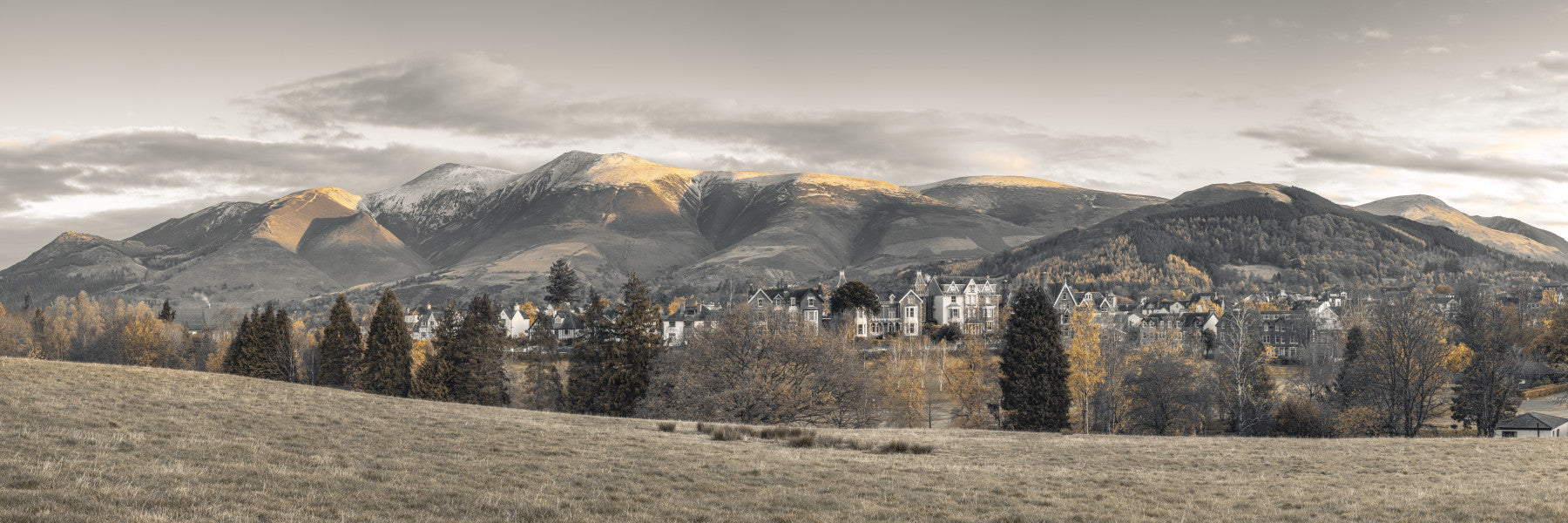 Bring the grandeur of the Lake District into your home with the Skiddaw Mountain View Wall Mural. This sweeping landscape captures the timeless charm of Keswick village nestled beneath the majestic Skiddaw range. Tinted in soft sepia and dusk gold, the mural evokes early evening calm and rustic elegance. Ideal for living rooms, studies, or hallways, it offers a sense of depth and stillness. The subtle contrast between shadowed valleys and sunlit peaks makes this wallpaper for walls both grounded and atmospheric—a tribute to Britain’s scenic beauty.