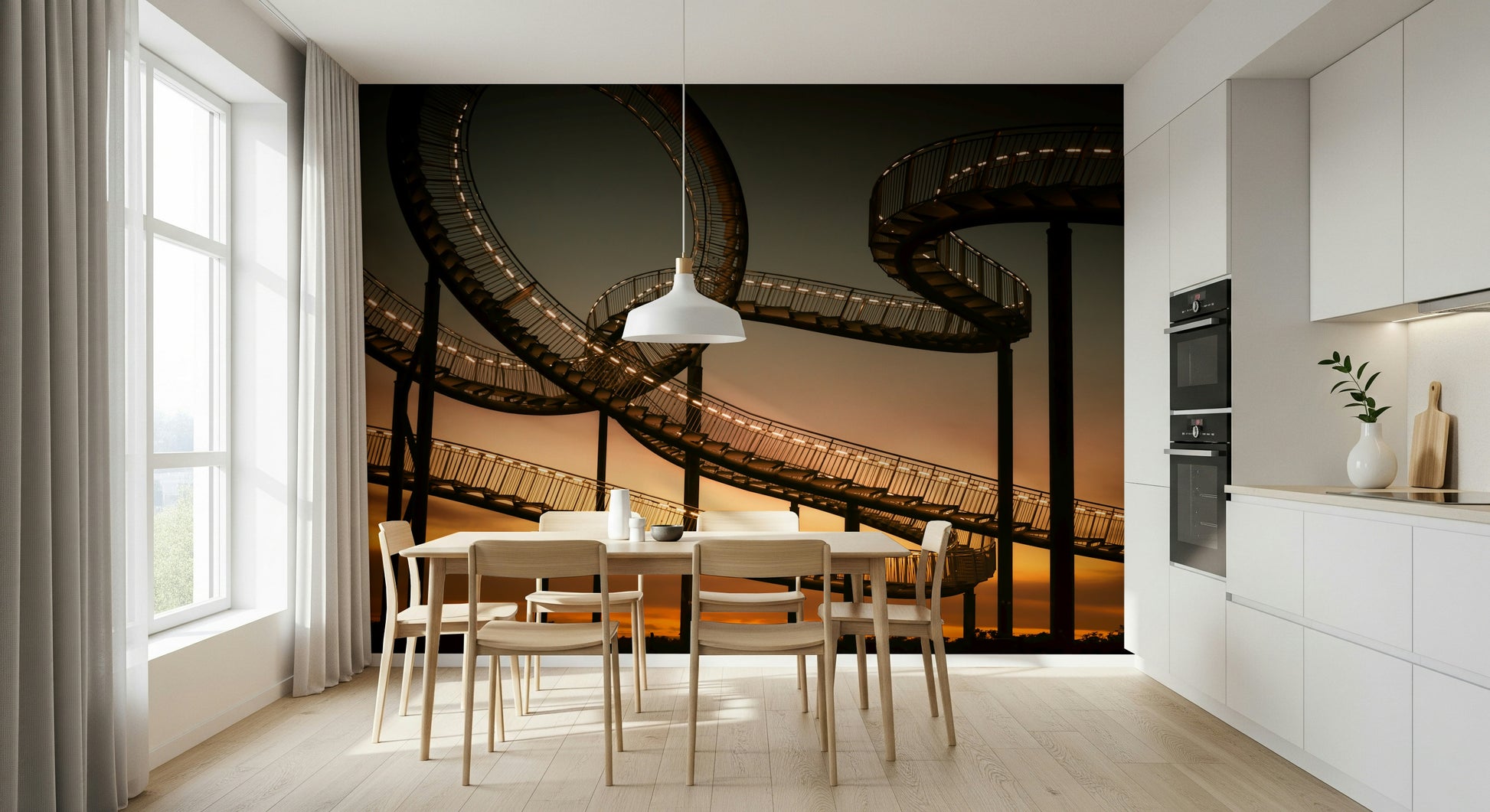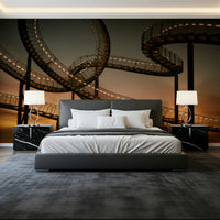 Ascend into a dreamlike vista with "Sky Steps", a wallpaper that transforms your screen into a gateway to the heavens. This mesmerising image captures a fantastical stairway stretching towards a fiery sunset. Illuminated by rows of warm, inviting lights, the metallic structure weaves and loops, creating an illusion of infinite ascent. The evocative blend of industrial design and natural beauty evokes a sense of wonder and limitless possibility. Let your imagination soar as you contemplate the journey ahead, with each step a path to new heights. Ideal for those who seek inspiration and a touch of surreal artistry in their digital space, "Sky Steps" offers a calming yet captivating backdrop. Add a layer of depth and intrigue to your device with this stunning fusion of architecture and twilight's embrace.