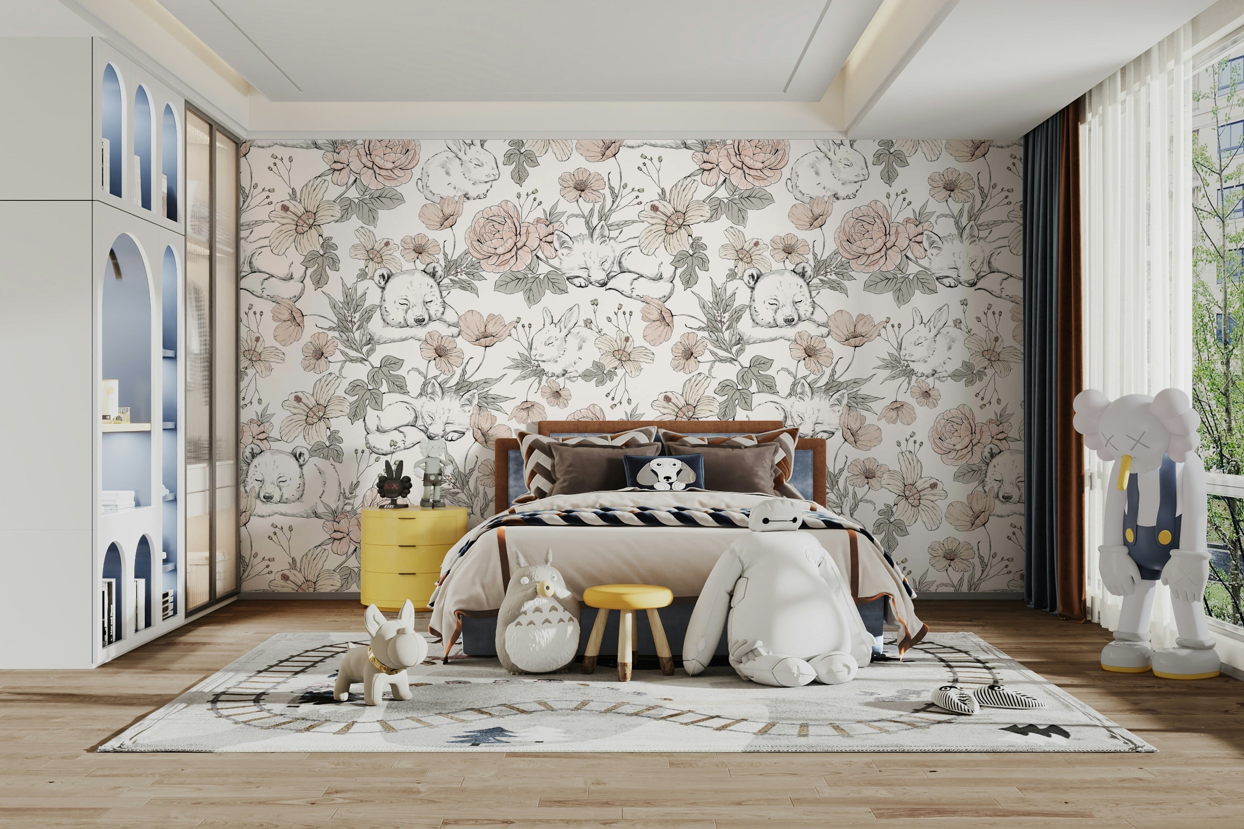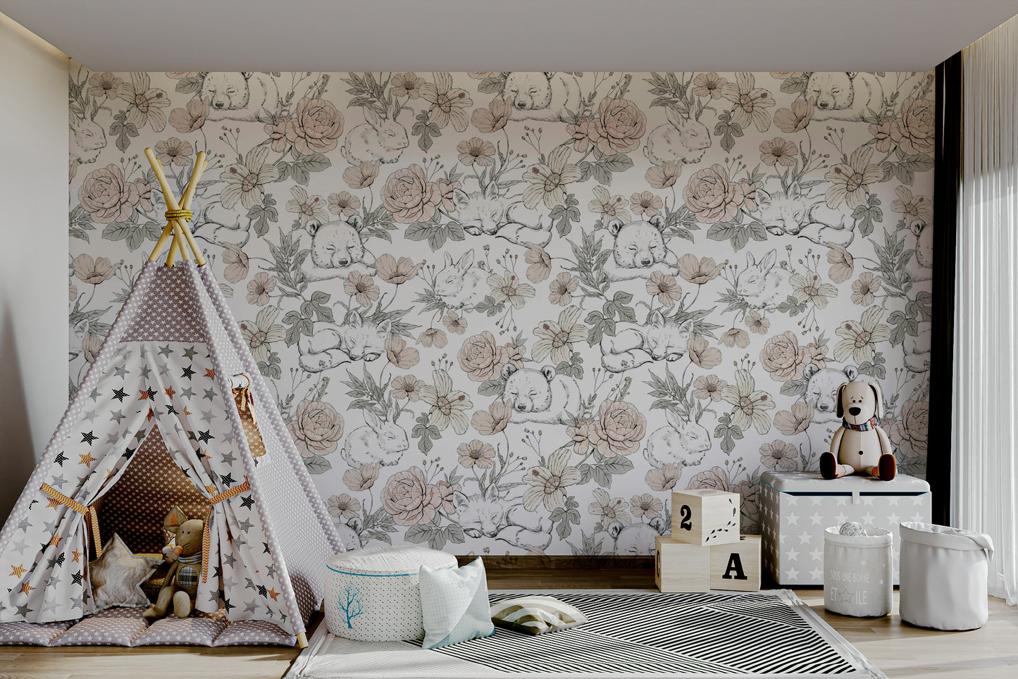 Drift into a dreamy forest scene with our Sleeping Woodland wallpaper a charming design that captures the magic of bedtime in the woods. Delicately illustrated with sleeping koalas, foxes, bunnies, and gentle blooms in soft pastel tones, this wallpaper brings a calming, storybook quality to any child’s space. Perfect for nurseries, reading nooks, or playrooms, its hand-drawn style creates a cozy and imaginative atmosphere. Crafted with love and easy to apply, it’s a sweet escape into nature’s quiet moments. Let your little one rest surrounded by the soft whispers of the forest and the comfort of sleepy woodland friends.
