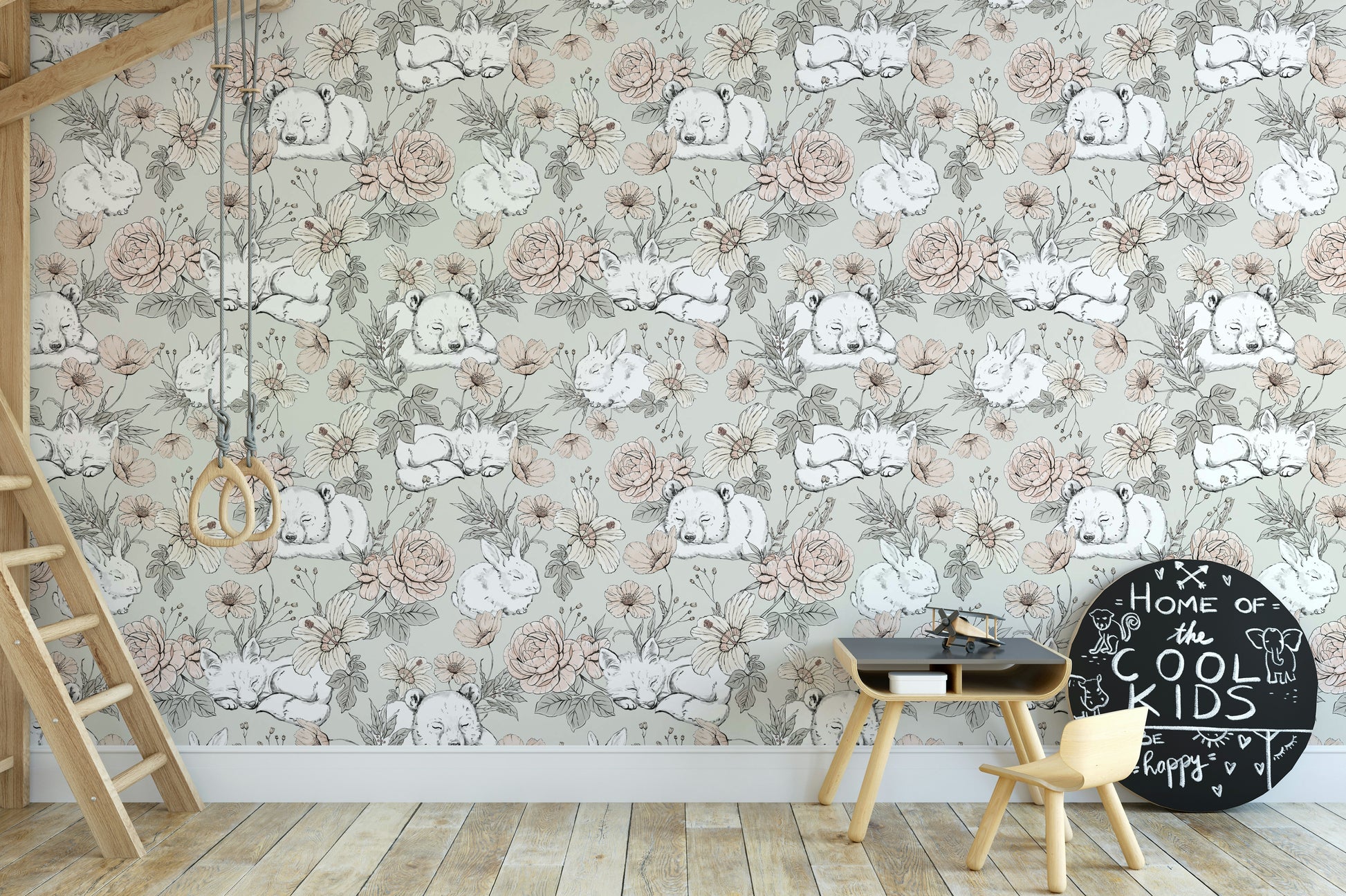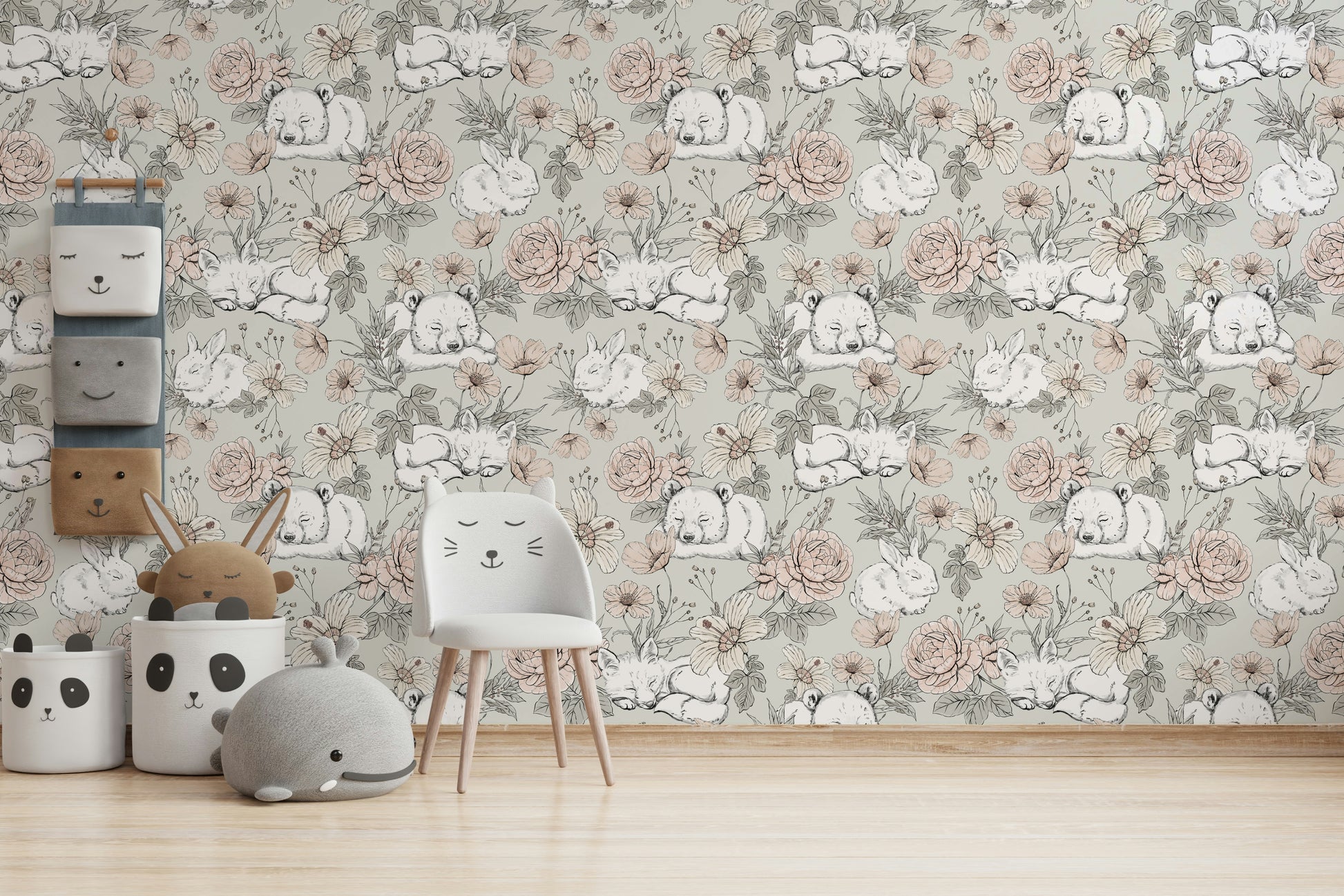 Drift into a gentle woodland dreamscape with our Sleeping Woodland – Sage Green wallpaper. Featuring softly sketched foxes, koalas, and bunnies nestled among hand-drawn florals, this design evokes peaceful forest scenes in delicate, earthy tones. The sage green backdrop adds a touch of natural calm, making it ideal for nurseries, reading corners, or toddler rooms. Every glance invites quiet wonder, helping little ones relax and feel at ease. Crafted for easy application and lasting charm, this wallpaper turns any wall into a whimsical retreat. Let your child’s space bloom with nature’s quiet magic and cuddly woodland friends.