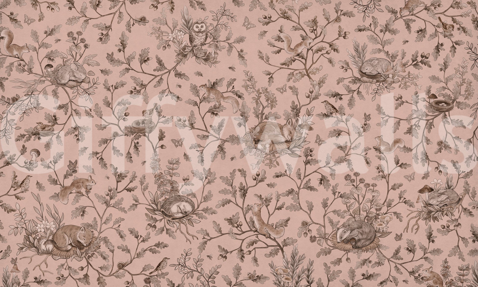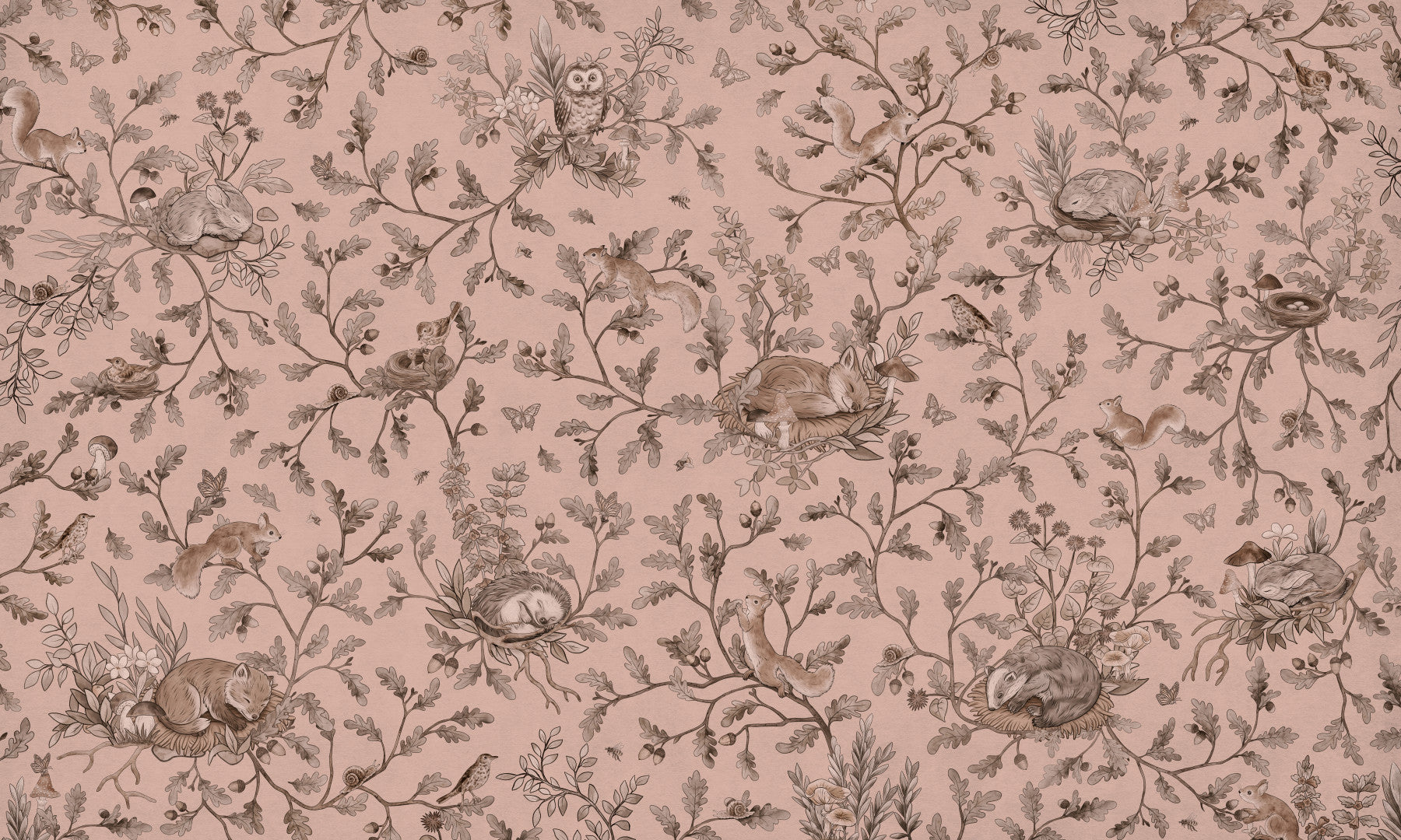 Invite tranquility into your home with Sleepy Hollow. This design presents a peaceful pattern of slumbering woodland creatures amongst delicate oak branches, presented in soft browns on a gentle pink backdrop. The intricate detailing and classic style evoke a sense of calm. Perfect for creating a cosy and inviting atmosphere in bedrooms, nurseries, or reading nooks. This wallpaper for walls is a charming way to complement interiors while adding an element of organic charm.