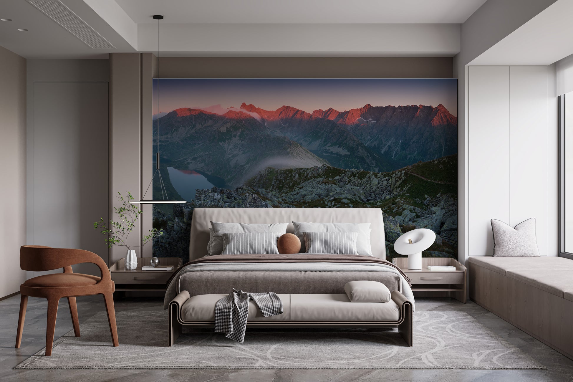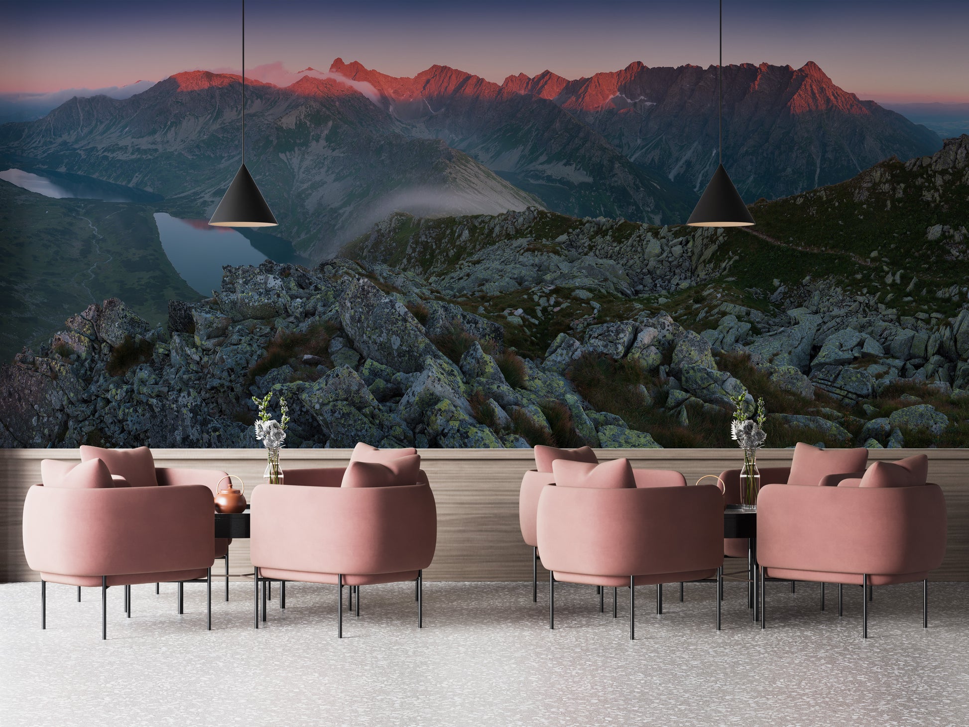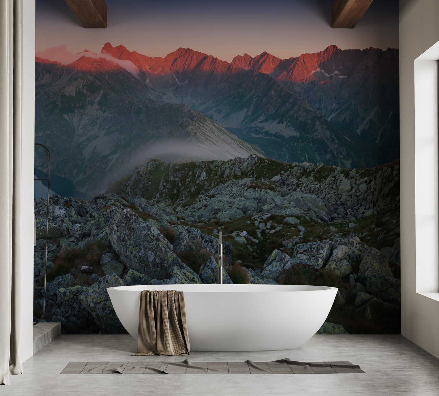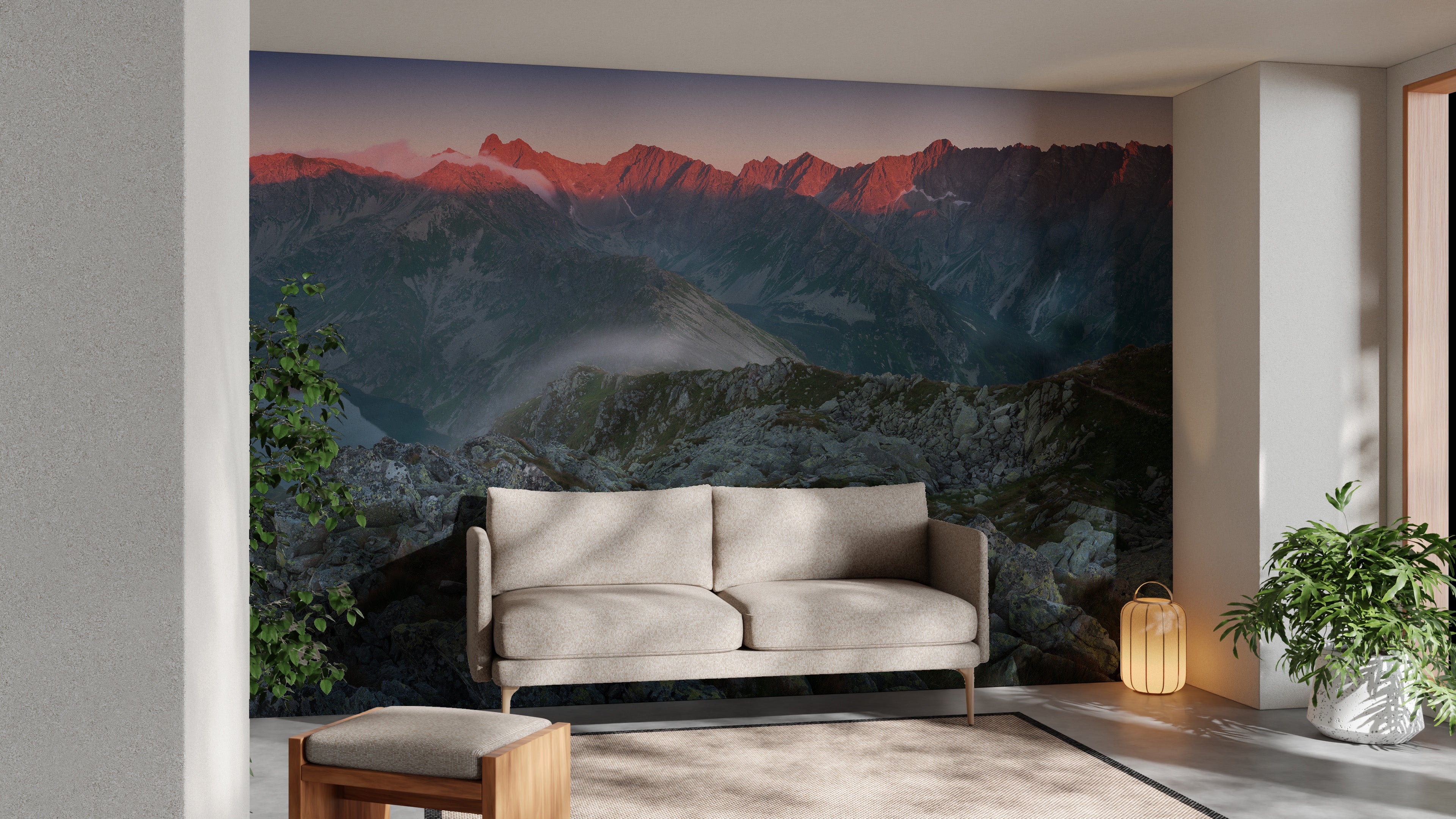 Step into a world of natural grandeur with our Slovakian mountain sunset wallpaper mural. This mountain wallpaper mural captures the essence of the High Tatra Mountains National Park, bringing the beauty of the Slovakian wilderness right into your living space. Witness the magic of the mountain ranges bathed in the glow of sunset, combined with the striking contrast of snowy peaks. This high-resolution sunset photo wallpaper transforms any room into a focal point of admiration and conversation. Ideal for enhancing your living room, it pairs beautifully with furniture in white and grey shades, accentuating the mural's vivid colors and intricate details. Make a bold statement and bring a piece of the great outdoors inside, ensuring a unique and impressive ambiance in your home.
