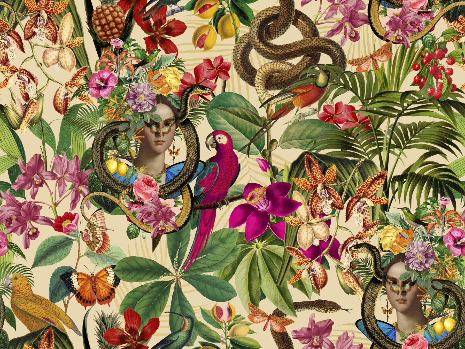 Imaginative edgy collage with historical portrait of a woman with exotic flowers and snake in vibrant colors. Experience the mesmerizing allure of this fantasy design that transports you straight into an enchanted rainforest, teeming with lush vegetation and exotic wildlife. The vibrant yellow backdrop depicts a mystic narrative that houses a magical snake princess, providing a bold and intriguing centerpiece. The blend of vivid birds and butterflies add a layer of depth and character to the decor. Every corner of this pattern speaks the language of a wildlife enthusiast with its careful representation of the surreal reptile kingdom. If you've fancied having an evergreen tropical oasis that narrates a mystical tale right in your living space, then this is it. Thisdesign is not merely an ordinary wallpaper, but a glorious celebration of the harmonious magic behind nature's most fascinating components.